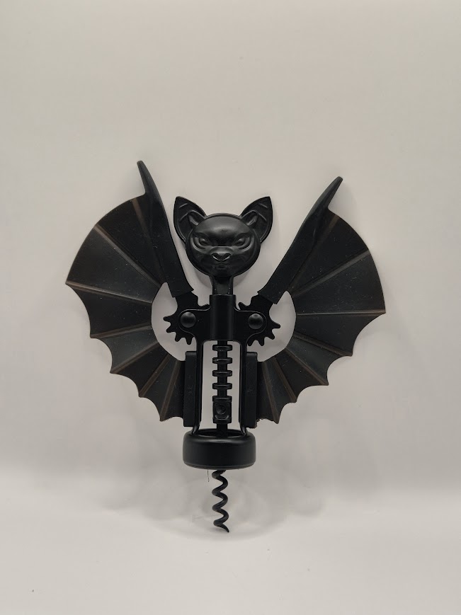 Abrecorchos con diseño de murciélago, ideal para vino, reuniones respetables o cenas que claramente no lo serán. Funcional, estable y con alas listas para desplegarse cuando el corcho ofrece resistencia.