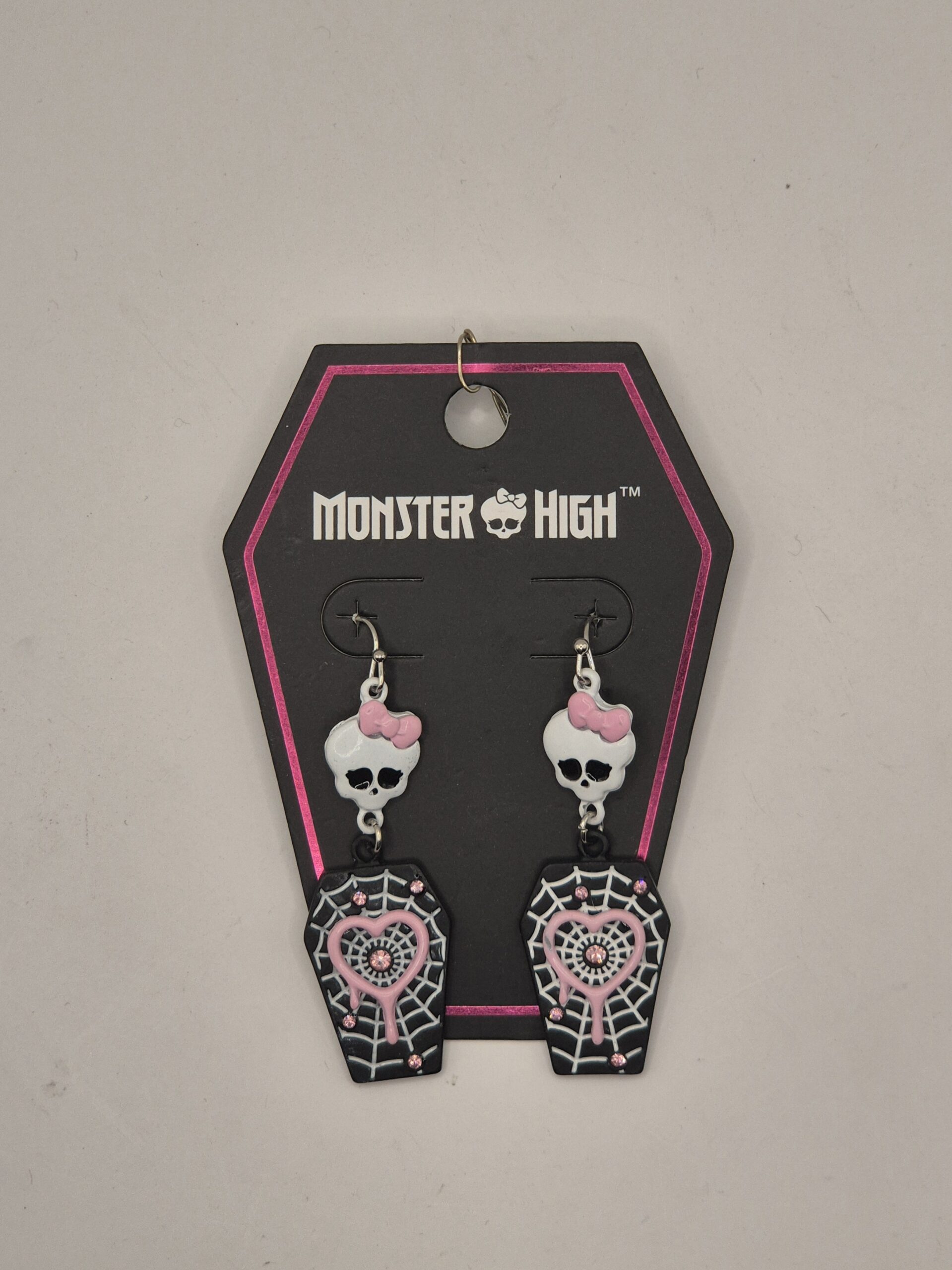 Uso: accesorio / aretes. Material: metal y resina. Diseño: calavera y ataúd con detalles rosas estilo gótico pop.