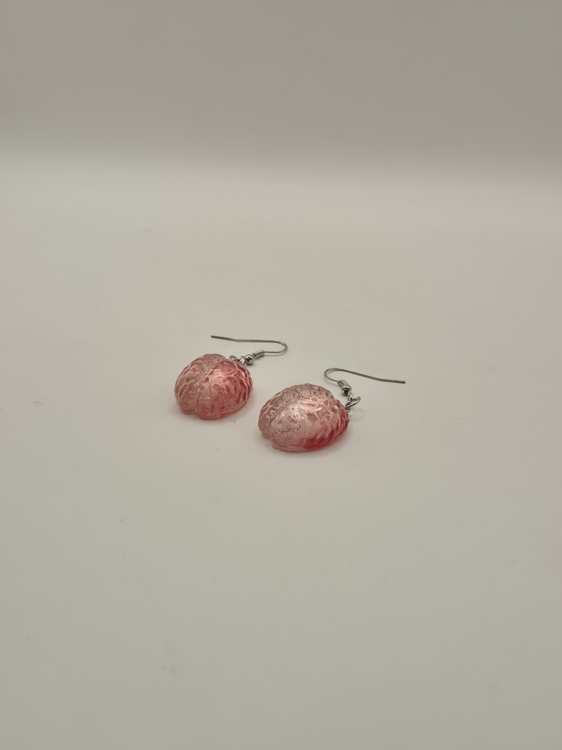 Material: resina translúcida rosa con detalles anatómicos moldeados. Gancho de acero inoxidable. Tamaño: aproximadamente 2 cm cada cerebro. Peso: ligero.