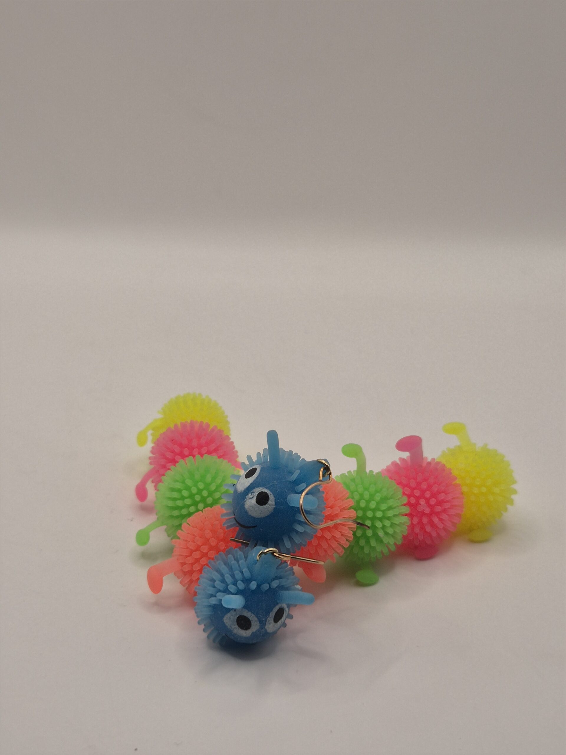 Material: goma suave con picos tipo silicón. Gancho metálico. Colores: neón variados (azul, rosa, verde, amarillo). Tamaño: aproximadamente 4 cm cada uno. Peso: ultraligero.