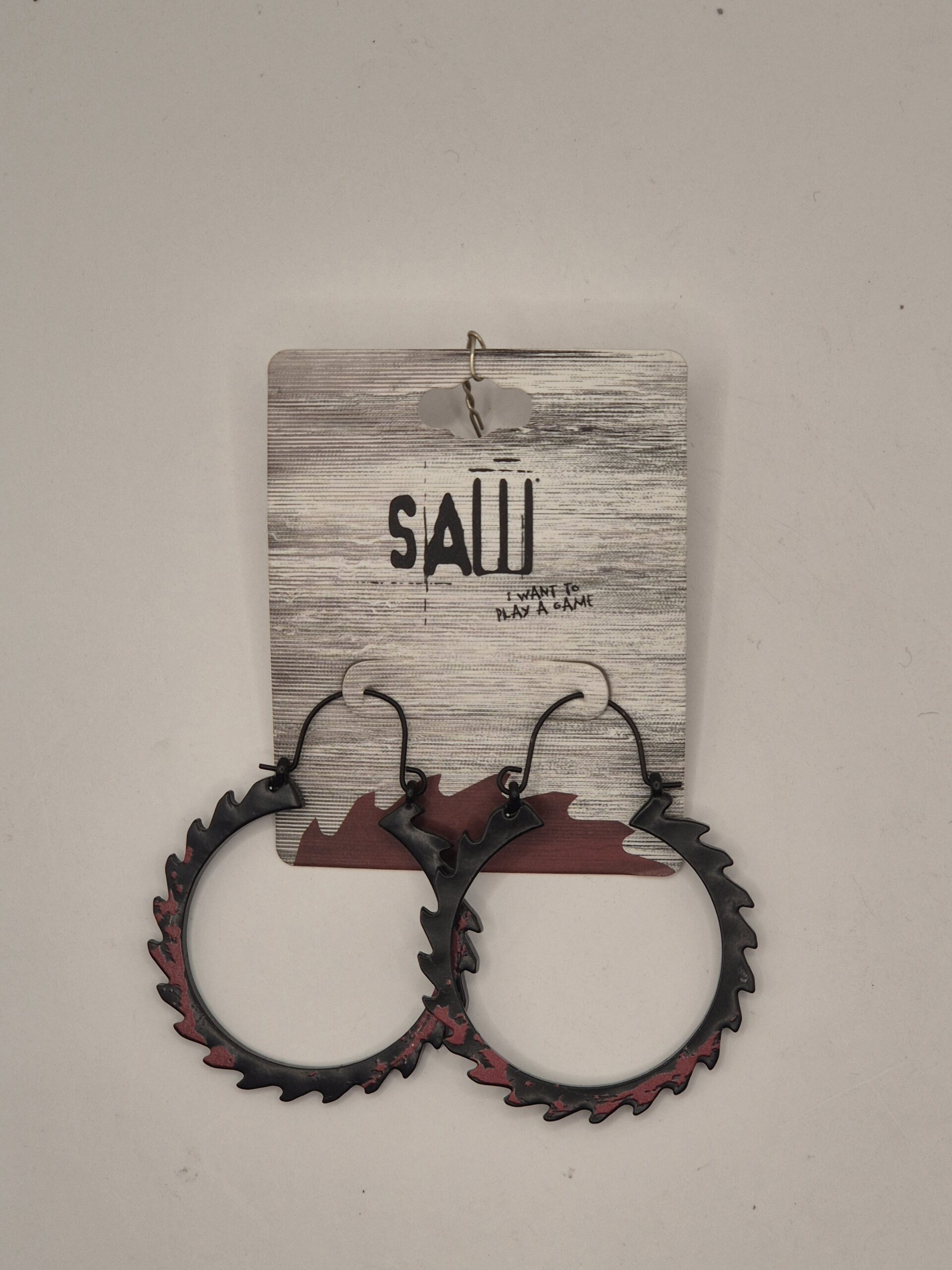 Uso: accesorio / aretes. Material: metal. Diseño: aro dentado estilo sierra, acabado oscuro con detalles rojos.