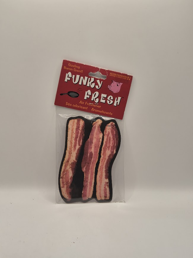 Aromatizante con forma de tiras de tocino, diseñado para colgar y perfumar espacios pequeños con un aroma intenso y deliberadamente absurdo. Funciona mejor cuando la intención no es frescura, sino provocar confusión, risas incómodas o una ligera preocupación colectiva.