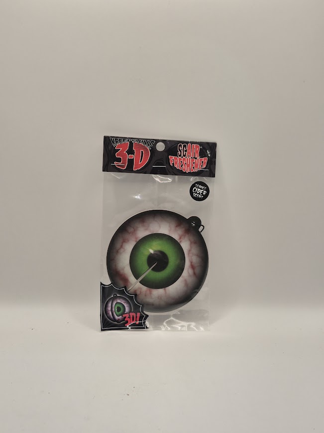 Aromatizante colgante con diseño de ojo en relieve 3D, acabado gráfico inquietante y estética de terror clásico. Ideal para auto, mochila, clóset o cualquier espacio donde quieras que el ambiente huela bien pero se sienta ligeramente vigilado.