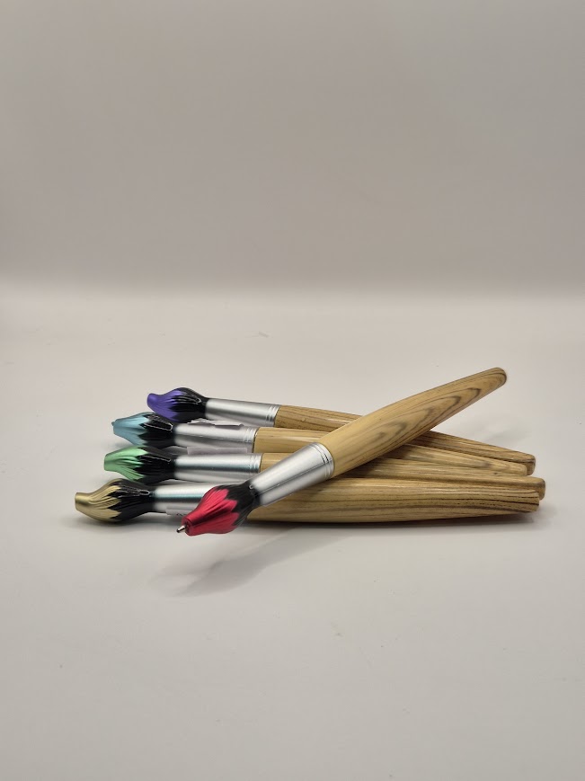 El cuerpo es tipo madera y la punta imita un pincel con cerdas de colores, pero escribe como bolígrafo normal. Funcionan bien para escritorio, escuela o para regalarle a alguien que siempre tiene mil plumones aunque solo use uno.
