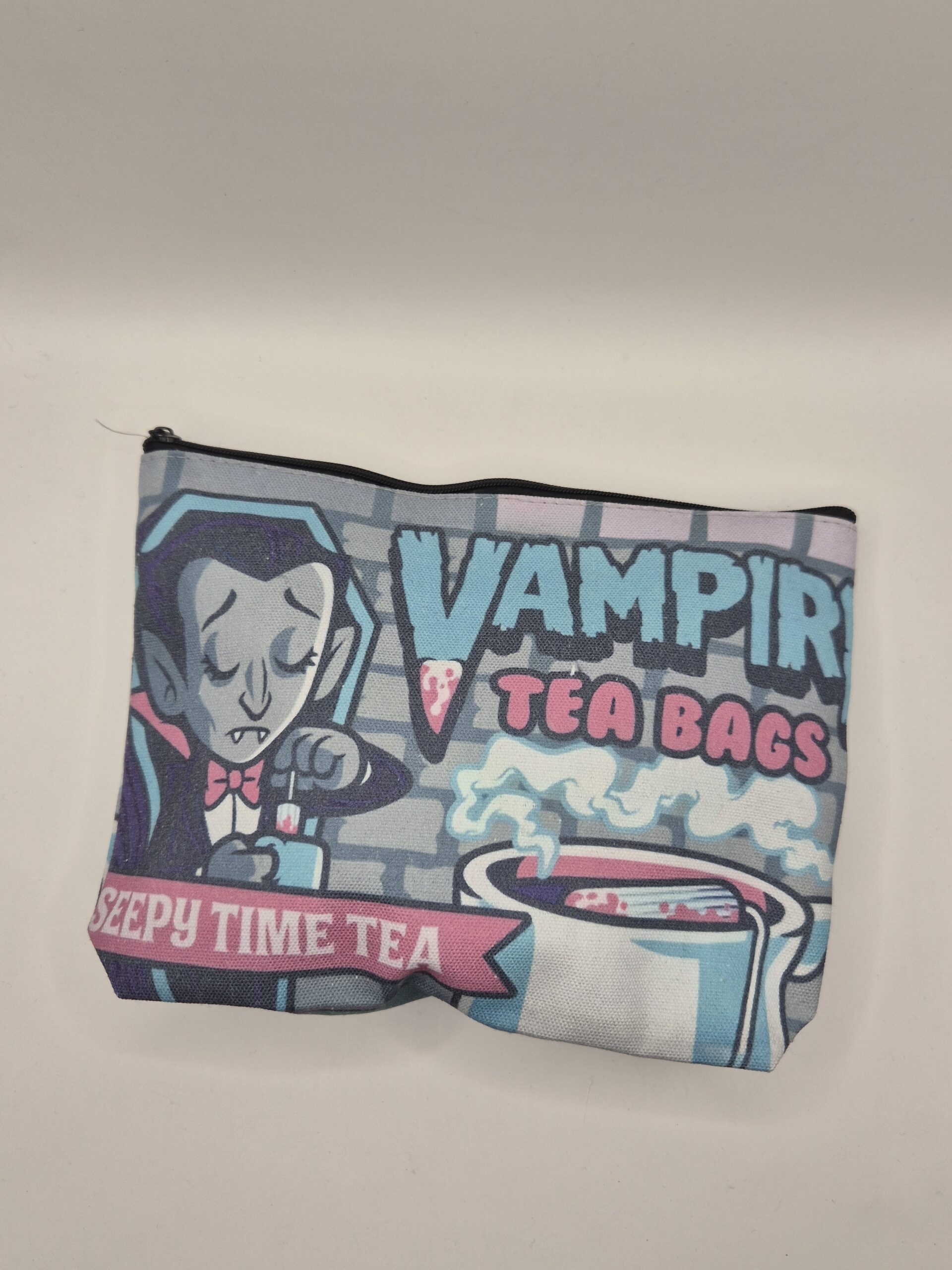 Bolsa de maquillaje con diseño de vampiro tomando té para guardar tus cosméticos, brochas, o ese labial rojo sangre que nunca encuentras cuando lo necesitas. Perfecta para la bolsa principal, el neceser de viaje, o para organizar tus cosas en el cajón del baño. Lo suficientemente espaciosa para tus básicos diarios. El cierre mantiene todo seguro y el diseño te recuerda que incluso las criaturas de la noche tienen rutinas de belleza.