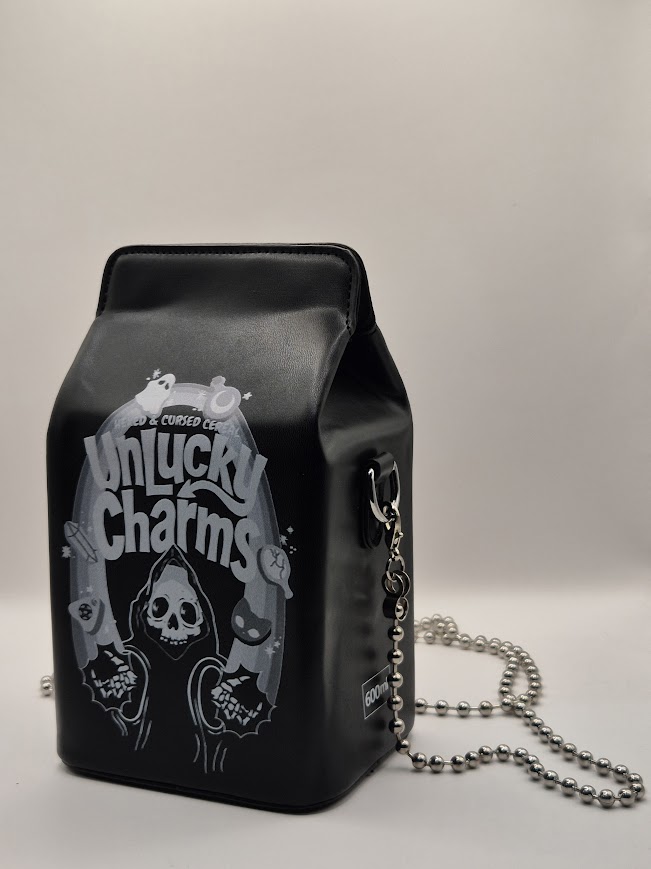 Bolsa tipo crossbody con diseño Unlucky Charms, ideal para cargar lo esencial mientras aceptas que hoy tampoco era tu día. Compacta, ligera y perfecta para salidas cortas, conciertos o rituales menores.
