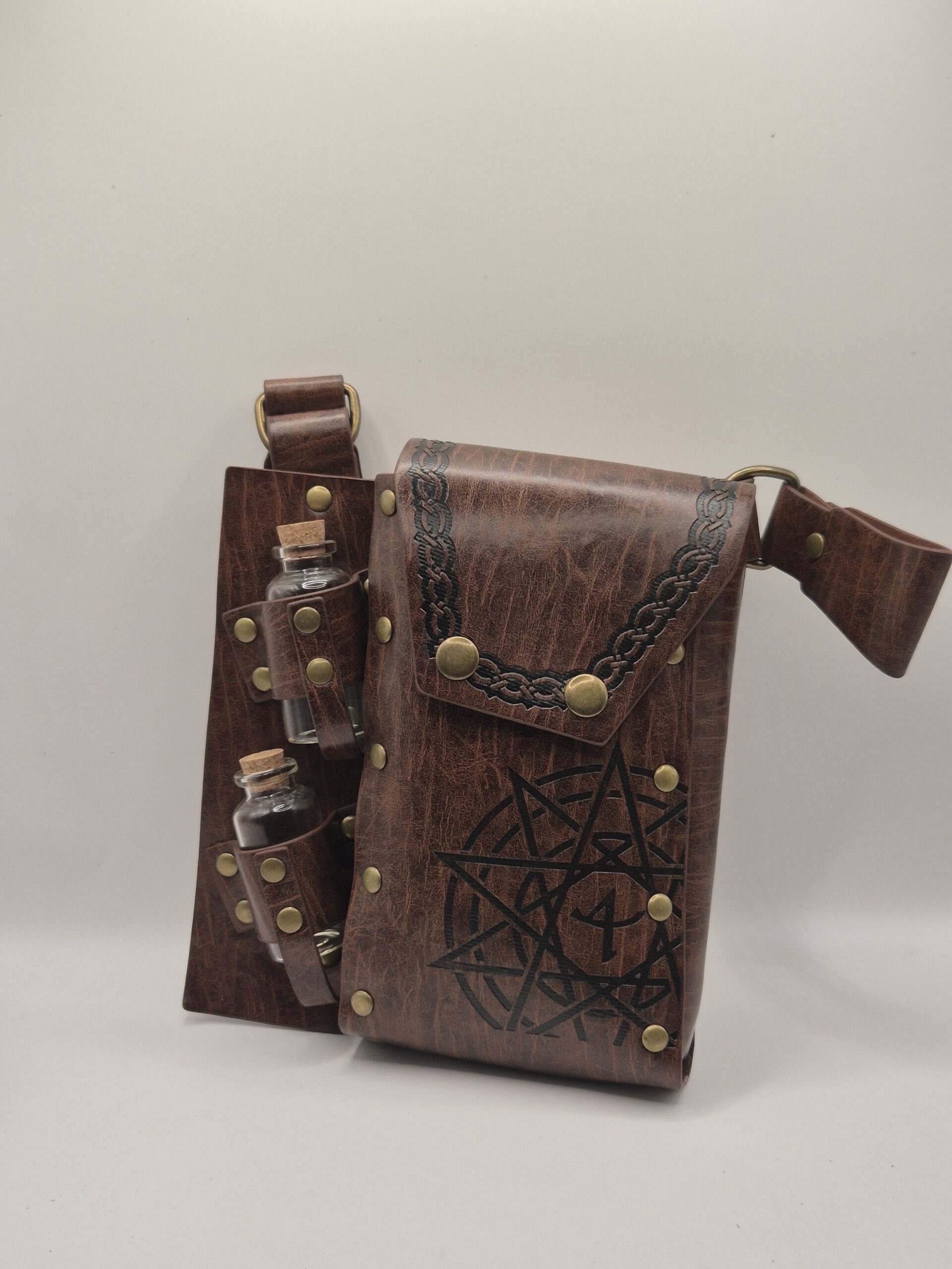 Incluye dos pequeños frascos de vidrio con tapón de corcho, sujetos en un compartimento lateral, ideales para pociones ficticias, utilería de rol o simple decoración temática. Cuenta con correa ajustable para llevarlo al hombro o cruzado, lo que lo hace práctico para ferias, cosplay, partidas de rol o como accesorio alternativo de uso diario.