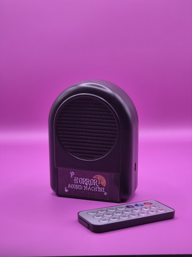 Caja de sonidos de terror con bocina integrada y control remoto, ideal para ambientar habitaciones, espantar visitas o recordarle a todos que aquí pasan cosas raras. Emite distintos efectos sonoros clásicos del horror con solo presionar un botón.