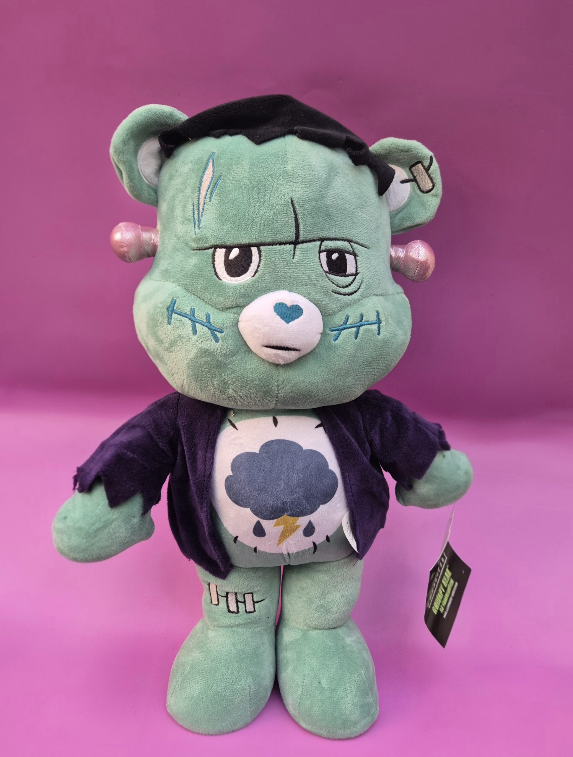 Franken-Grumpy presenta el característico gesto serio de Grumpy Bear reinterpretado como Frankenstein: cuerpo verde, costuras decorativas bordadas, expresión contenida y detalles gráficos que remiten al monstruo clásico sin perder el estilo suave del peluche. Viste una chamarra oscura sobre el pecho bordado con nube y rayo, integrando el imaginario Care Bears con el horror vintage.