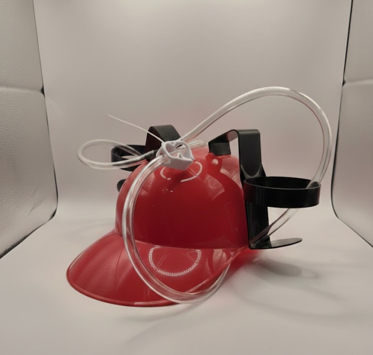 Casco para cerveza con soporte para dos latas o botellas, mangueras flexibles y válvulas listas para que bebas sin usar las manos. Ideal para fiestas, reuniones caóticas, asadores, videojuegos o para demostrar que la evolución humana tomó decisiones raras pero eficientes.