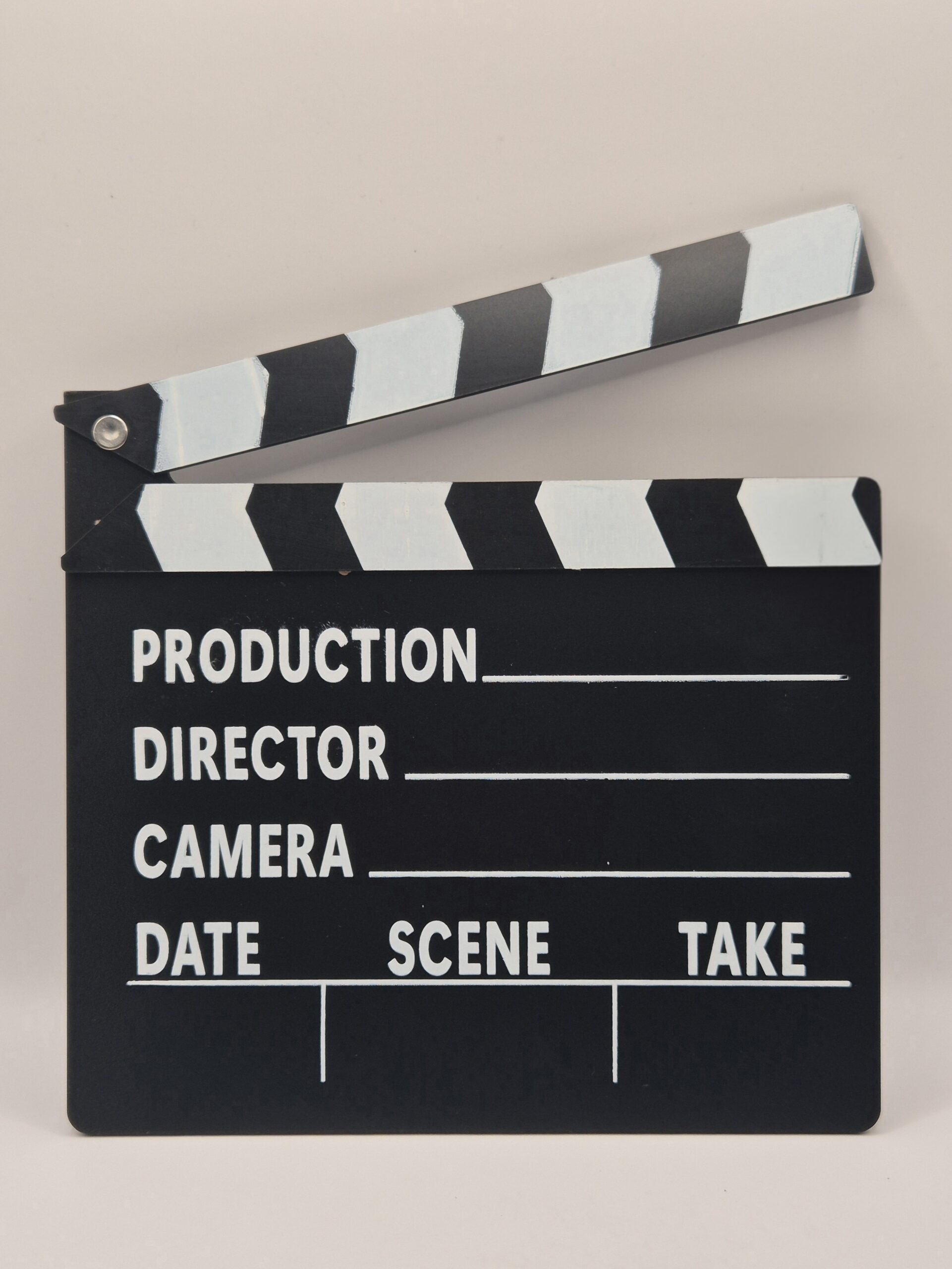 Claqueta de producción cinematográfica estilo Hollywood clásico para tus videos, TikToks, reels, o simplemente para colgar en la pared y fingir que eres más productivo de lo que realmente eres. Tabla con bisagra que hace ese sonido satisfactorio y campos para escribir con gis.