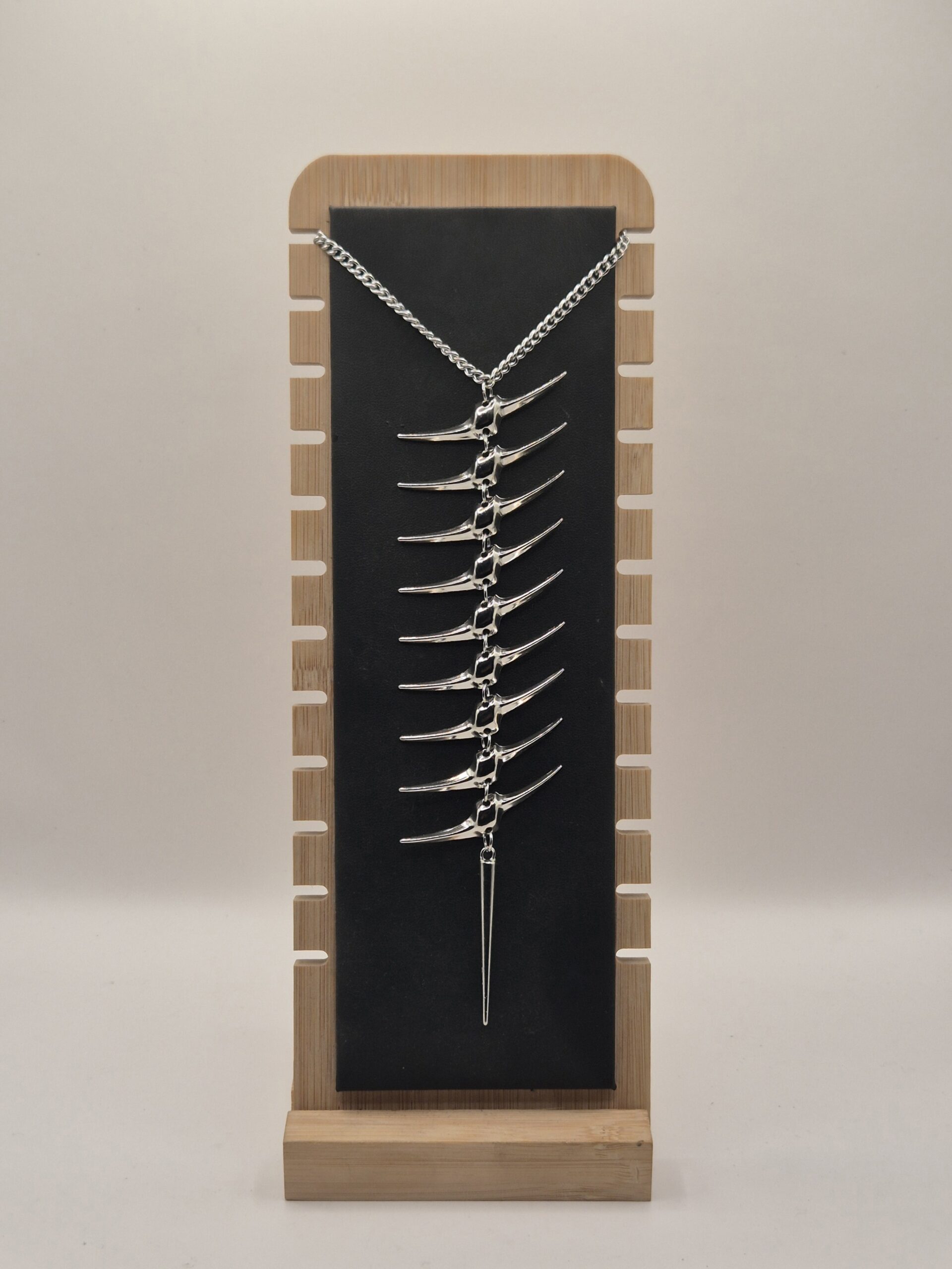 Collar de cadena metálica con dijes en forma de vértebras que cae por tu espalda simulando una columna vertebral expuesta. Para usar sobre escotes pronunciados, vestidos de espalda abierta. Perfecto para eventos, sesiones de fotos, o recordarle a la gente que todos somos huesos bajo la piel.