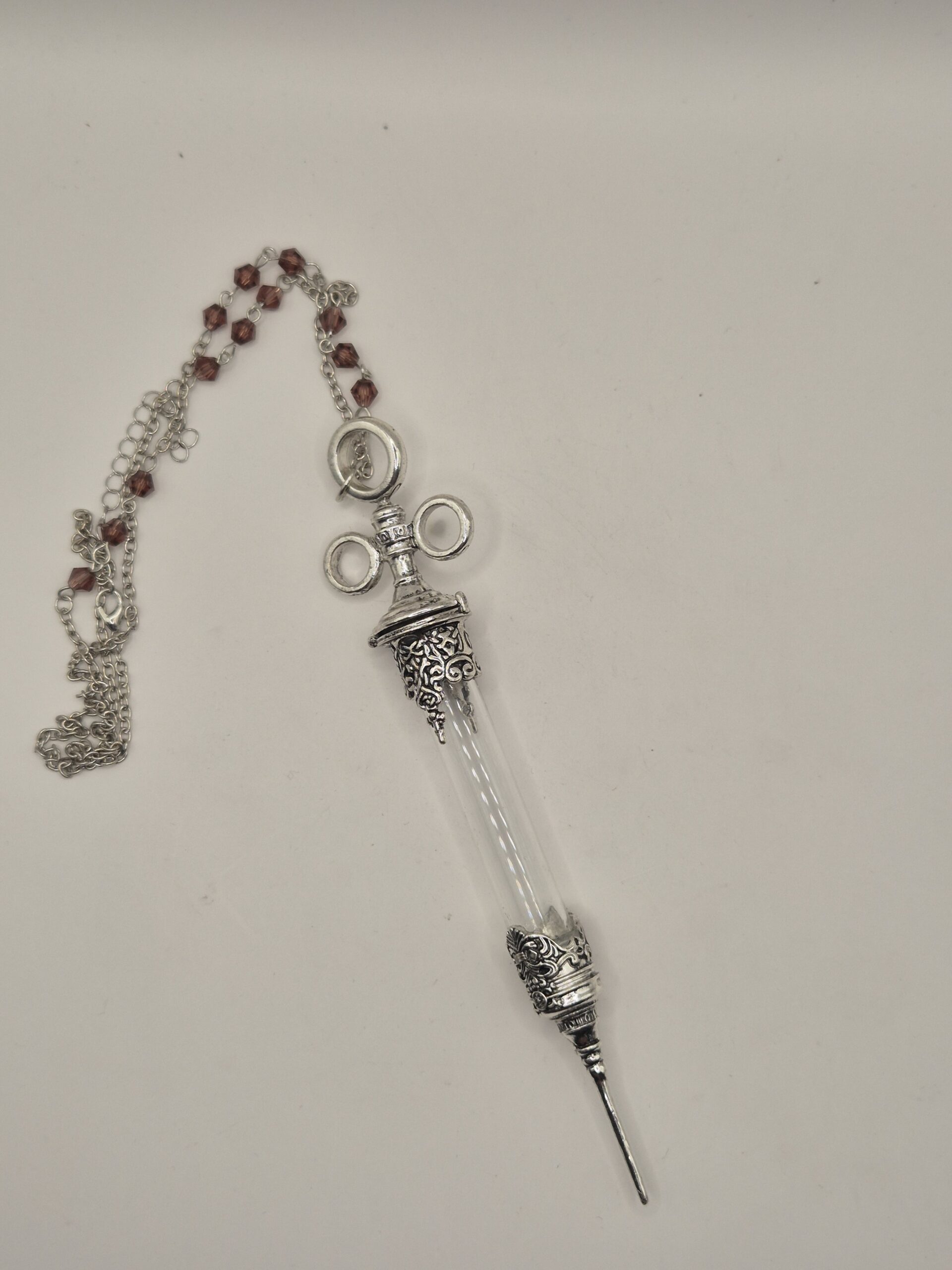 Collar con frasco de vidrio alargado y aguja metálica decorativa, pensado más como objeto simbólico que como herramienta práctica. La pieza combina estética esotérica, detalles ornamentales y una vibra de laboratorio dudoso. Ideal para complementar atuendos alternativos, cosplay ligero o para quien disfruta portar cosas que parecen tener un propósito oculto.