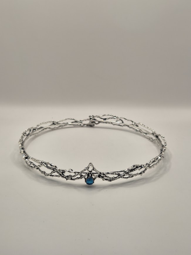 Tiara de estilo élfico con diseño de ramas entrelazadas y acabado metálico. Disponible en dos variantes: tono dorado con piedra oscura y tono plateado con piedra azul. Ligera, abierta por la parte trasera para ajuste cómodo y pensada para complementar looks fantásticos, góticos o de inspiración medieval.