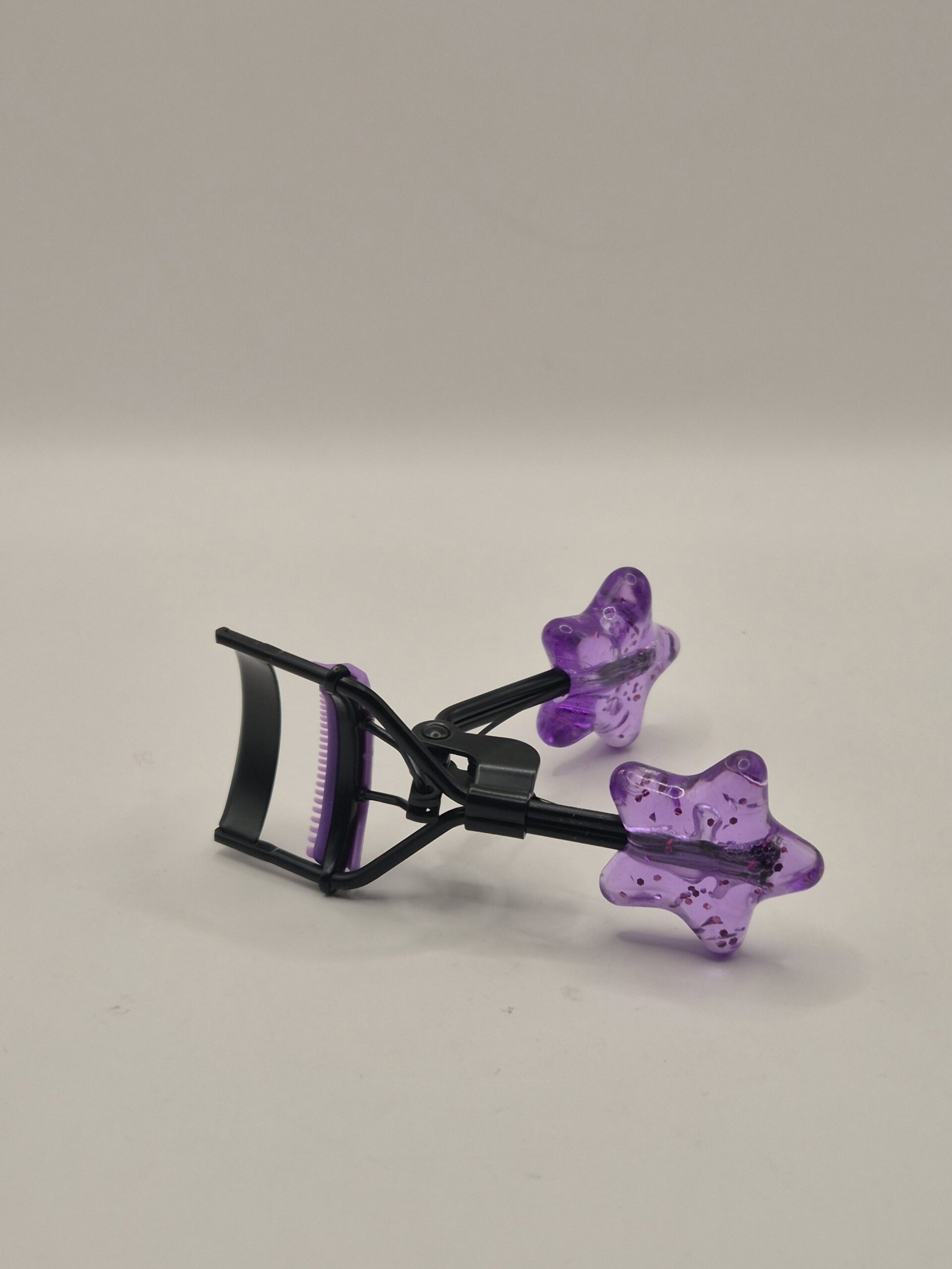 Enchinador de pestañas con mangos en forma de estrellas moradas con glitter porque si vas a ponerte en riesgo de pellizcar tu párpado, al menos que sea con algo adorable. Perfecto para tu neceser de maquillaje, el cajón del baño, o para convencerte de que rizarte las pestañas vale la pena cuando tu herramienta se ve así de bien. Funciona igual que cualquier enchinador pero con el beneficio añadido de tener estrellas que brillan mientras te preparas.