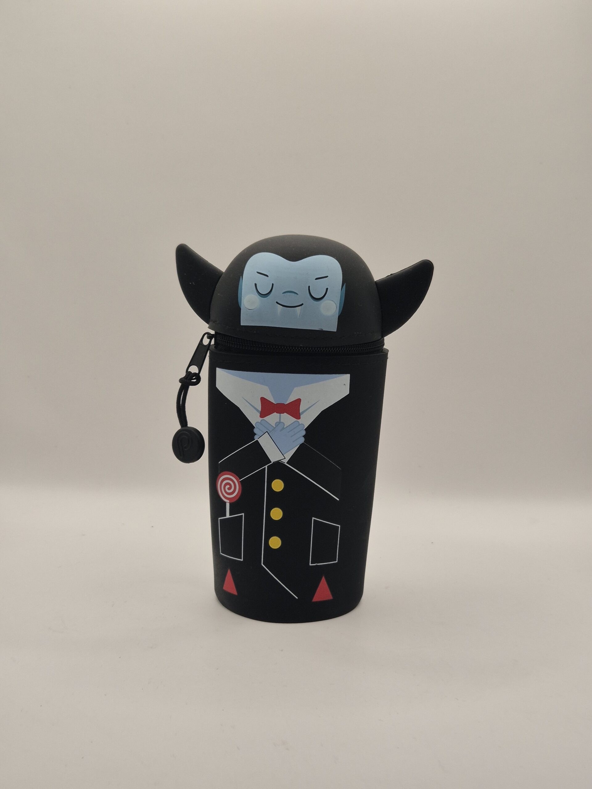 Este estuche con forma de vampiro tiene un diseño limpio, simpático y ligeramente siniestro: orejas puntiagudas, mirada tranquila y traje formal, como si acabara de salir de una junta nocturna. El material es flexible, suave al tacto y resistente, ideal para uso diario sin drama.