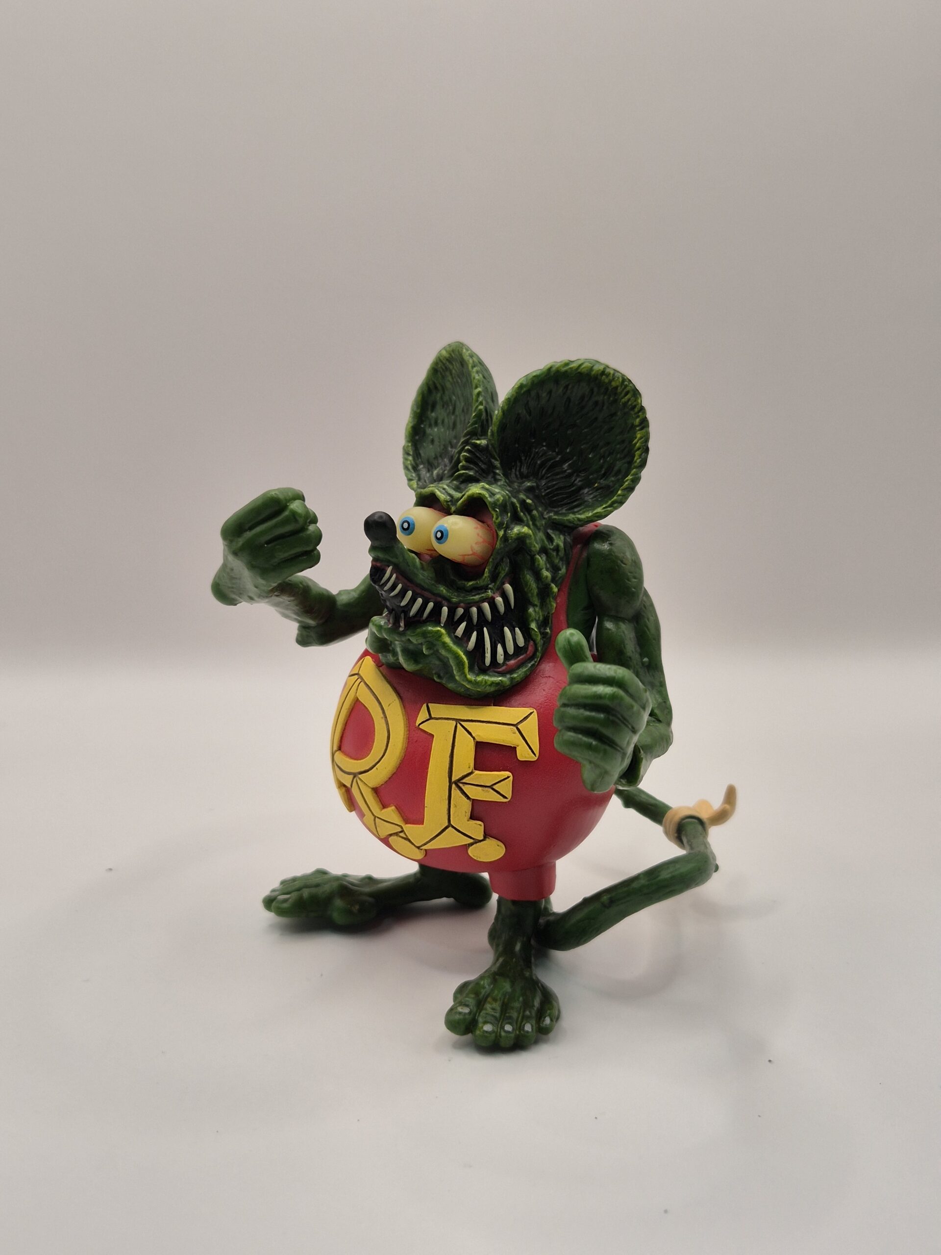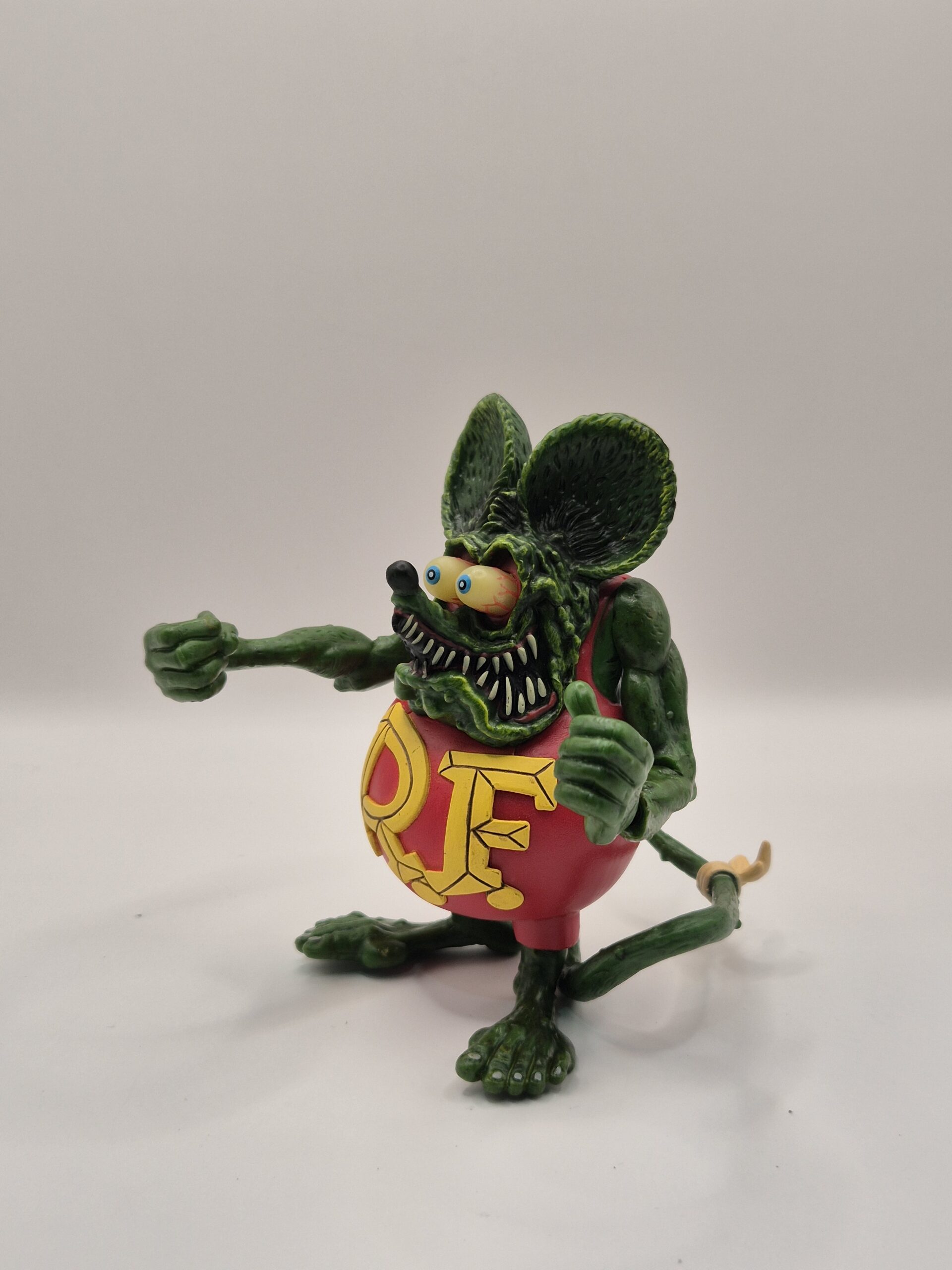 Figura decorativa estilo Rat Fink, con expresión agresiva, colores brillantes y actitud permanentemente problemática. Ideal para repisa, escritorio o para dejar claro que aquí se aprecia el arte incómodo y la cultura custom de dudosa moral.