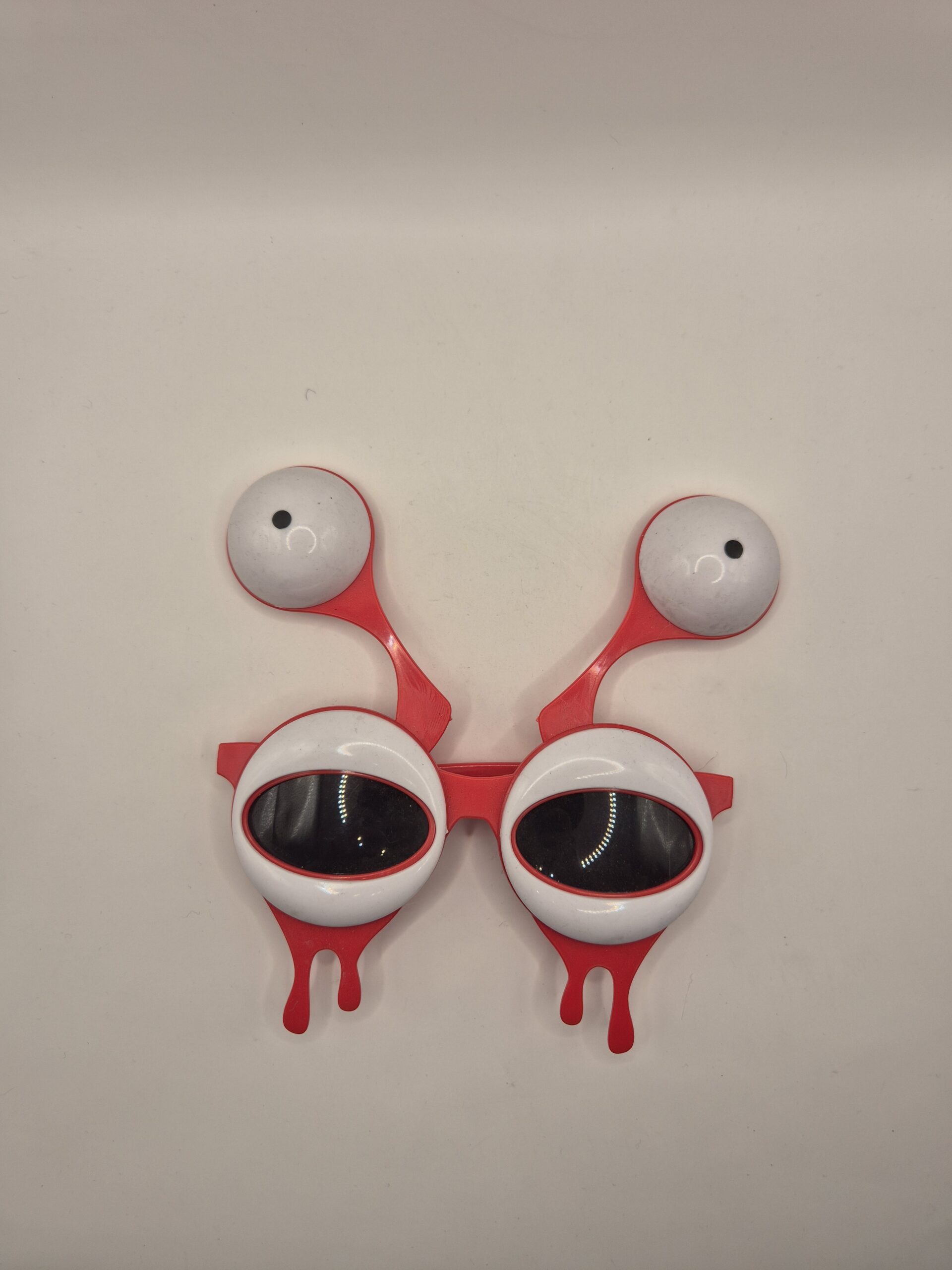 Gafas de sol con ojos saltones de plástico y efecto de sangre goteando para que todo el mundo sepa que no te tomas en serio ni a ti mismo. Perfectas para fiestas, Halloween, sesiones de fotos absurdas, o simplemente salir a la calle a incomodar gente. Los lentes oscuros sí funcionan, así que técnicamente estás protegido del sol mientras aterras niños.