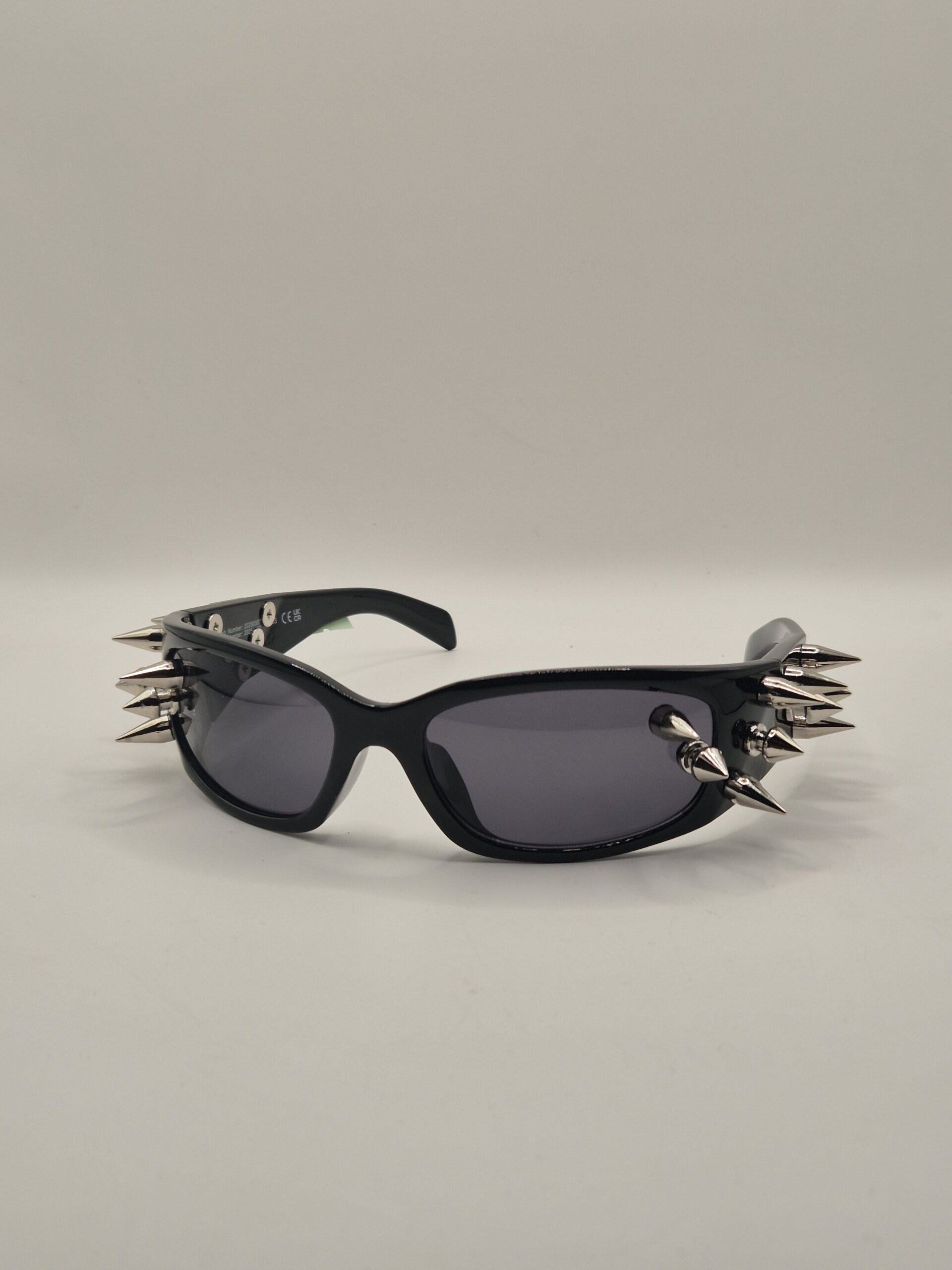 Uso: accesorio / moda alternativa. Material: plástico y metal. Diseño: lentes oscuros con picos metálicos laterales.