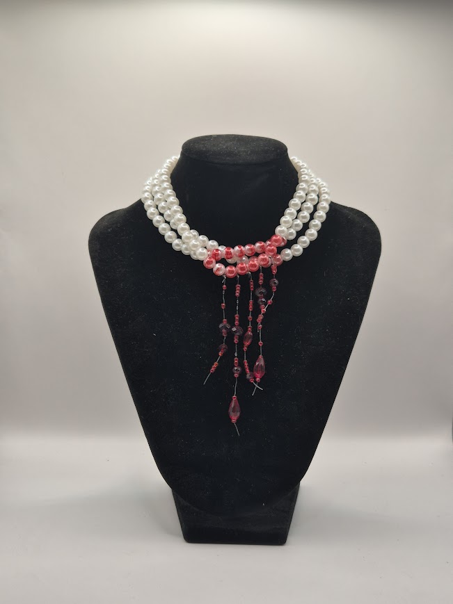 Gargantilla de perlas blancas con detalle central en tonos rojo sangre y caída de cuentas translúcidas, diseñada para parecer delicada… hasta que miras de nuevo. Un accesorio que mezcla lo clásico con lo perturbador, ideal para elevar cualquier atuendo oscuro sin perder compostura.