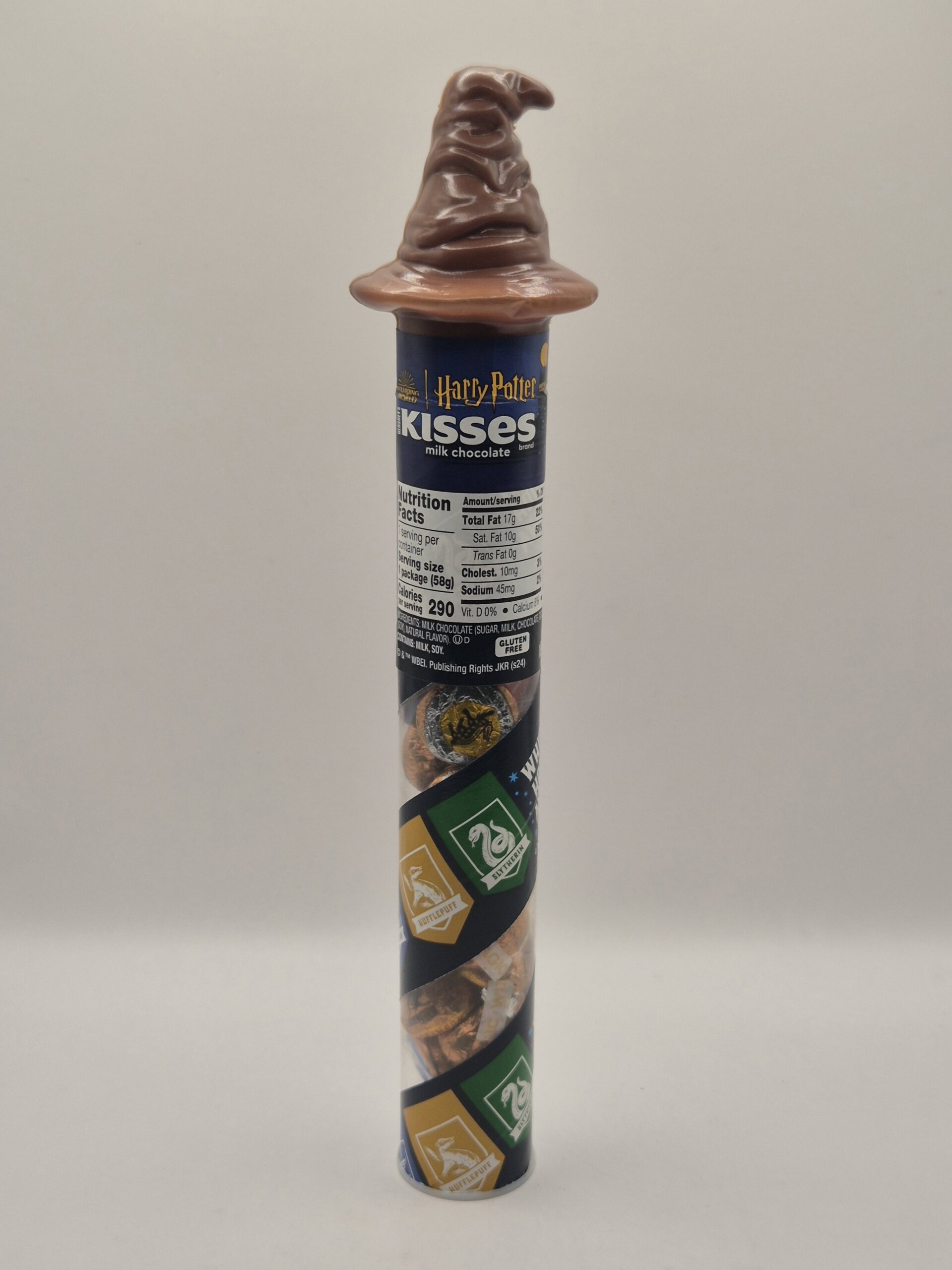 Contenido: chocolates Kisses de leche. Presentación: tubo con tapa de Sombrero Seleccionador. Edición temática Harry Potter. Empaque coleccionable.