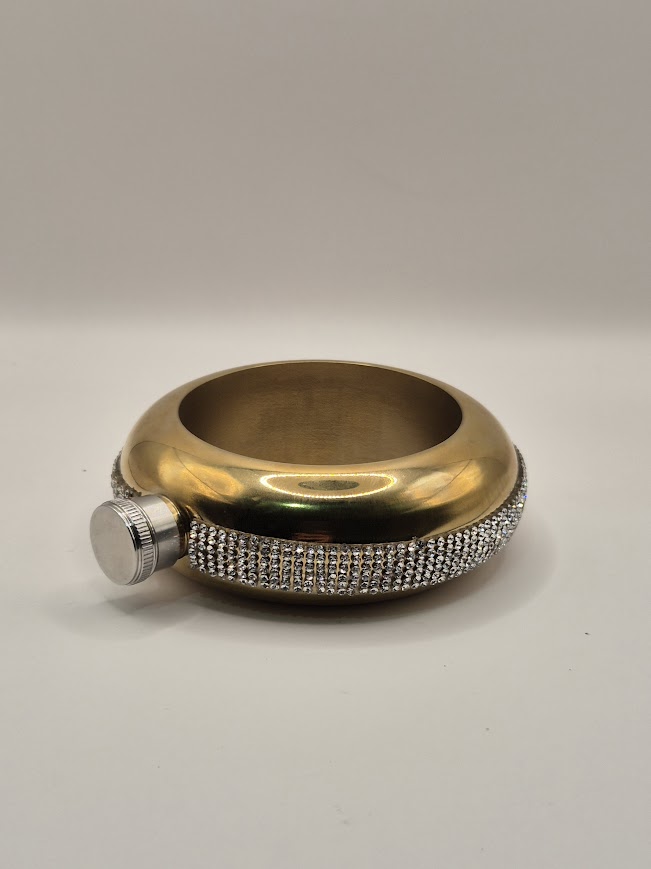 Licorera con diseño de pulsera rígida, ideal para portar bebidas espirituosas de forma elegante y ligeramente sospechosa. Compacta, brillante y perfecta para eventos donde el agua no es suficiente.