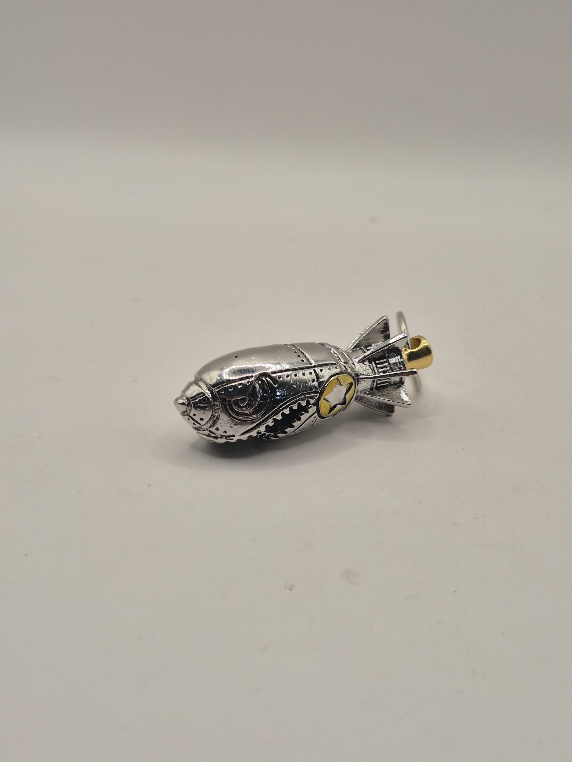 Material: metal con acabado plateado y detalles dorados. Diseño: bomba cohete con grabados mecánicos. Argolla resistente.