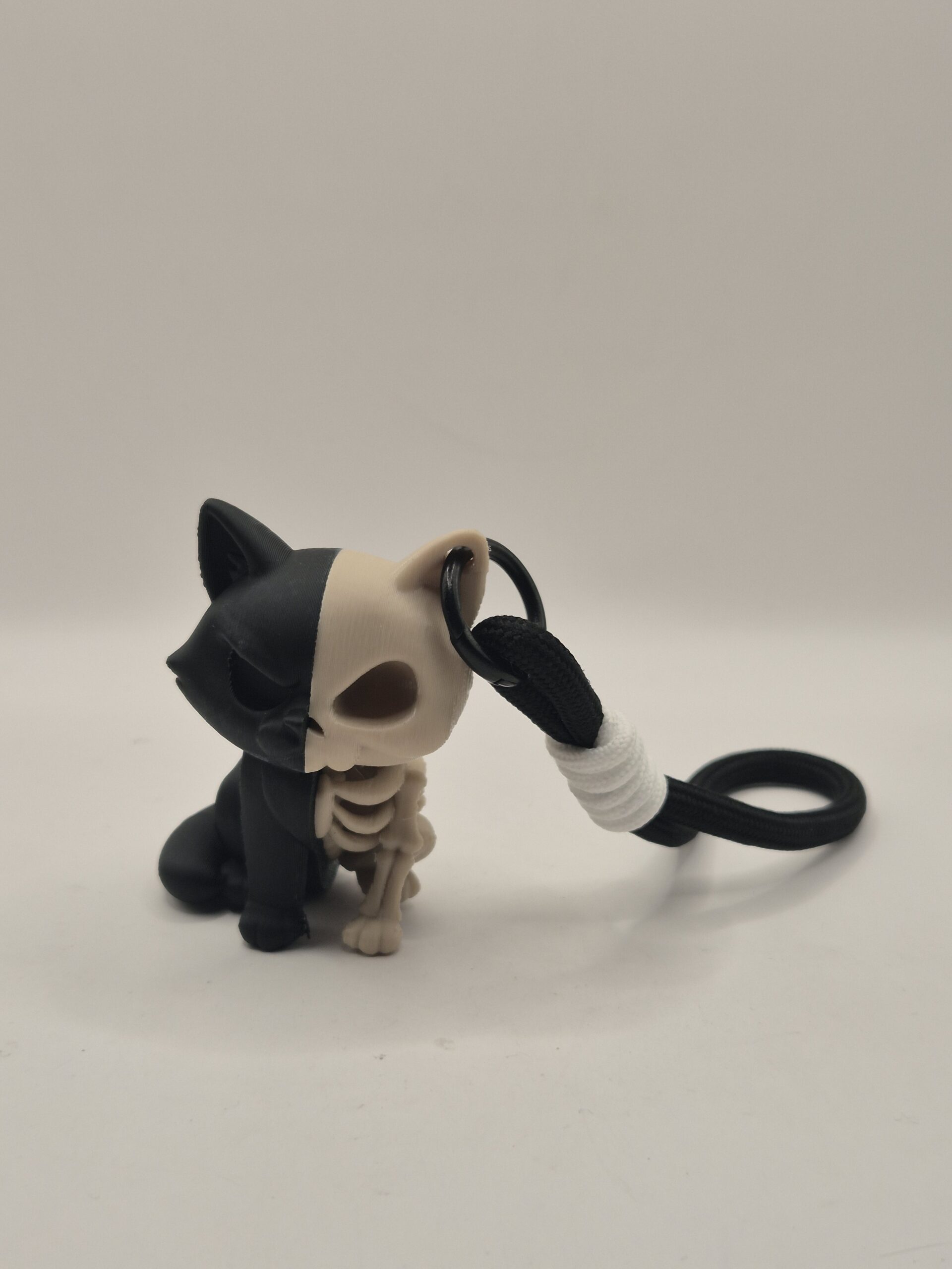 Llavero de gato dividido verticalmente en dos mitades: una muestra el exterior felino normal y la otra revela su esqueleto completo. Perfecto para tus llaves, mochila, o para recordarte que todos somos huesos cubiertos de tejido blando intentando aparentar normalidad. Ideal para estudiantes de veterinaria, amantes de gatos con inclinaciones góticas, o cualquiera que aprecie que la anatomía y lo adorable pueden coexistir en el mismo objeto.