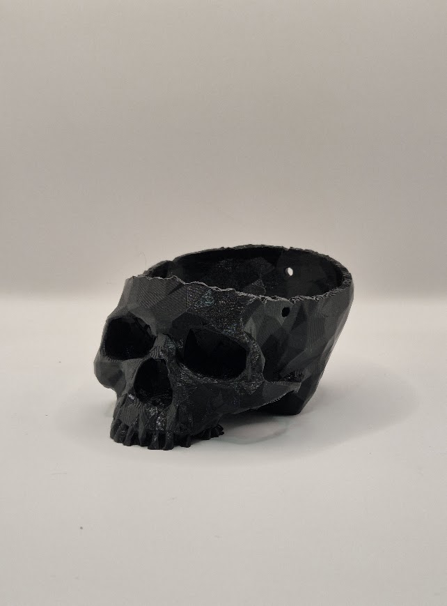 Maceta con forma de cráneo en acabado geométrico, de estética oscura y textura facetada. Fabricada en plástico rígido mediante impresión 3D, con un diseño que resalta sombras y volúmenes desde cualquier ángulo. Ideal para suculentas, cactus o plantas pequeñas que se beneficien de un contenedor con carácter.