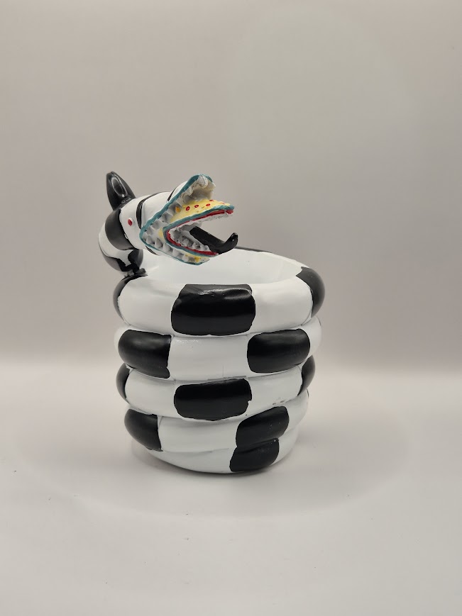 Maceta decorativa con diseño de Sandworm, reconocible por su patrón blanco y negro y su expresión permanentemente agresiva. Ideal para suculentas, plantas pequeñas o para albergar vida vegetal en condiciones cuestionables.