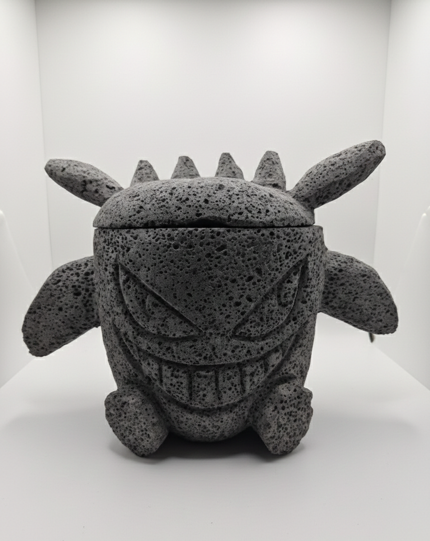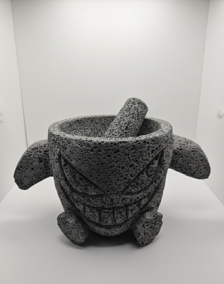 Este molcajete Gengar está tallado en piedra volcánica y combina función real con una presencia que intimida: sonrisa maliciosa, orejas puntiagudas y pura energía monstruosa.