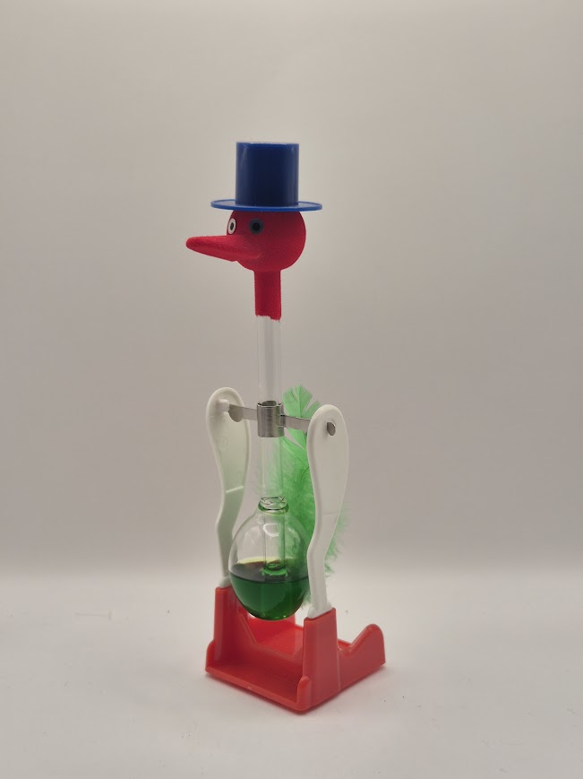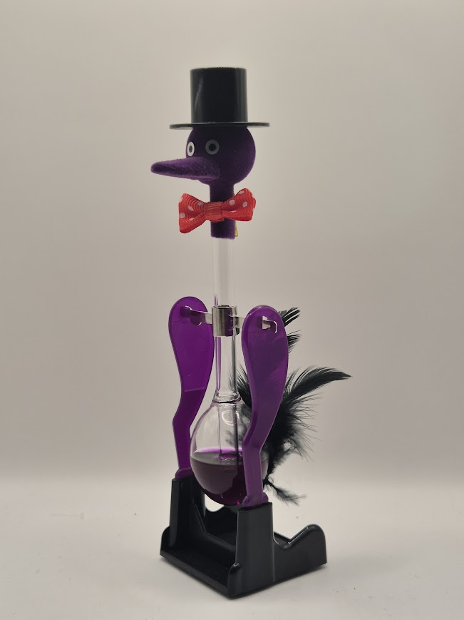 Juguete de movimiento perpetuo tipo pájaro bebedor, en su versión clásica y versión darks. Funciona mediante un ciclo continuo de evaporación y balanceo, inclinando la cabeza una y otra vez de forma constante, sin cansancio ni criterio. Ideal para escritorio, repisa o como recordatorio de que no todo debería quedar en automático.