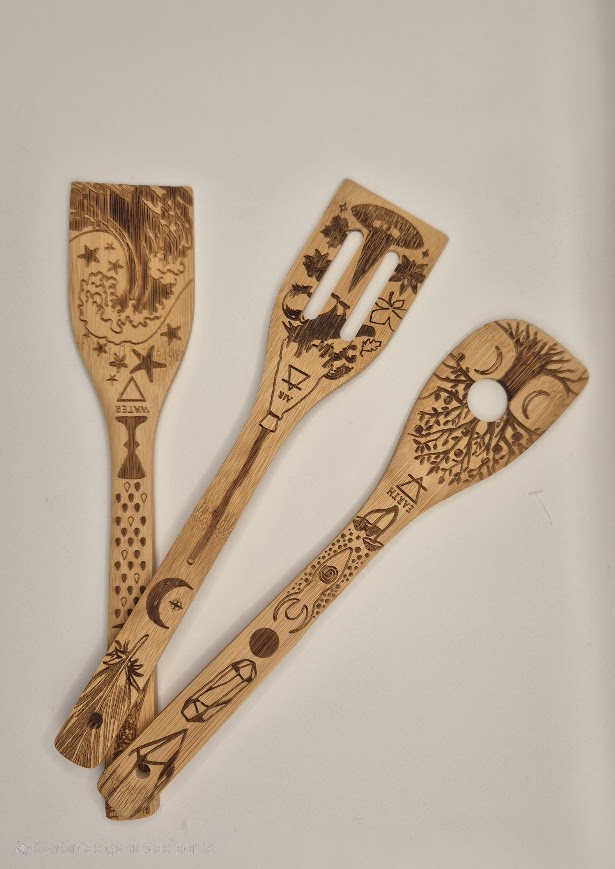 Utensilios de cocina de madera grabados con motivos místicos, pensados para quienes revuelven la comida como si fuera un conjuro. Lunas, estrellas y símbolos que convierten cualquier guiso cotidiano en un pequeño ritual doméstico.