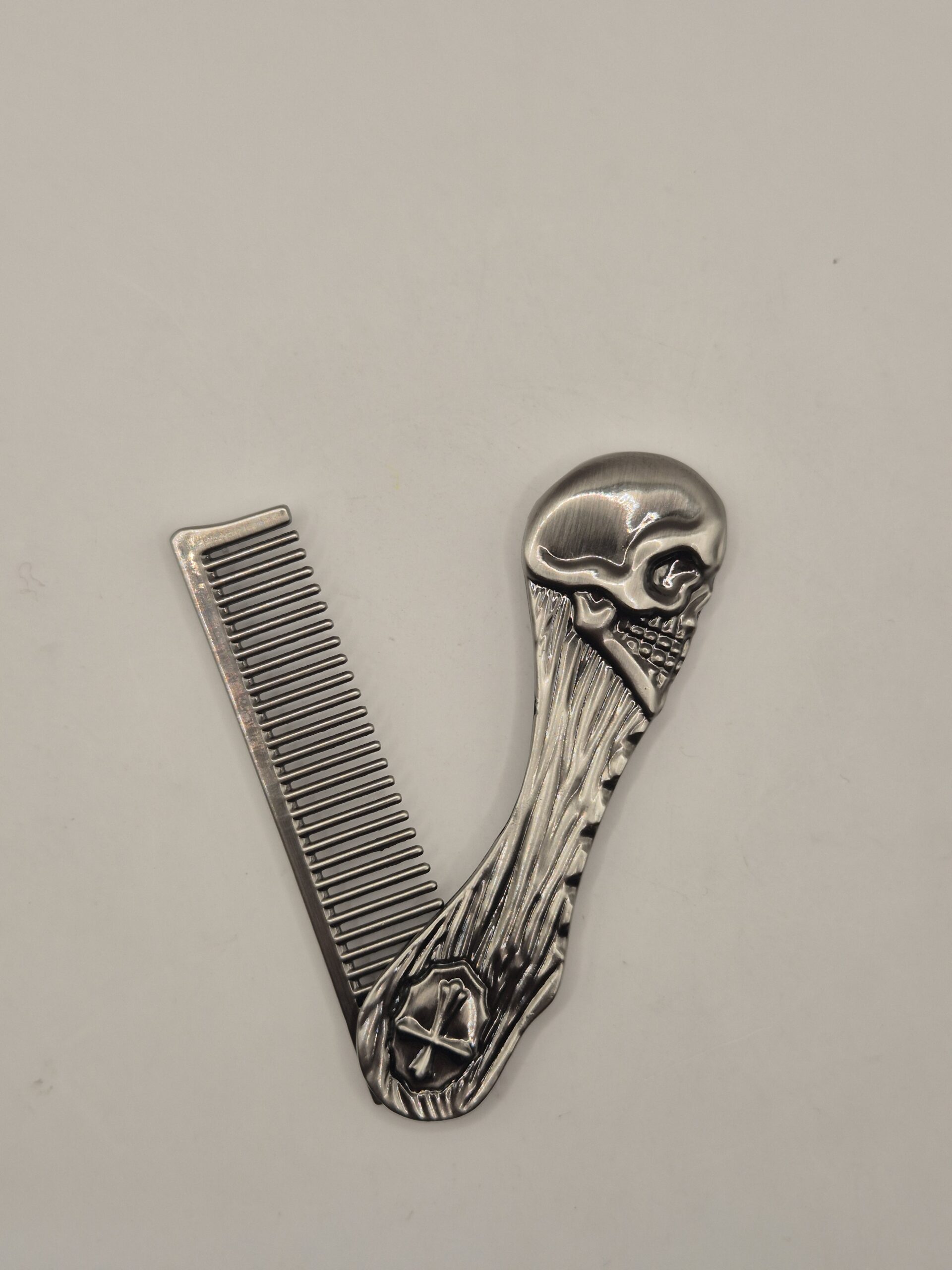 Peine metálico de bolsillo con diseño de cráneo, perfecto para traer en la mochila, la chamarra o el pantalón y sobrevivir cualquier emergencia estética. Compacto, resistente y elegante. Ideal para acomodarte el cabello, la barba.
