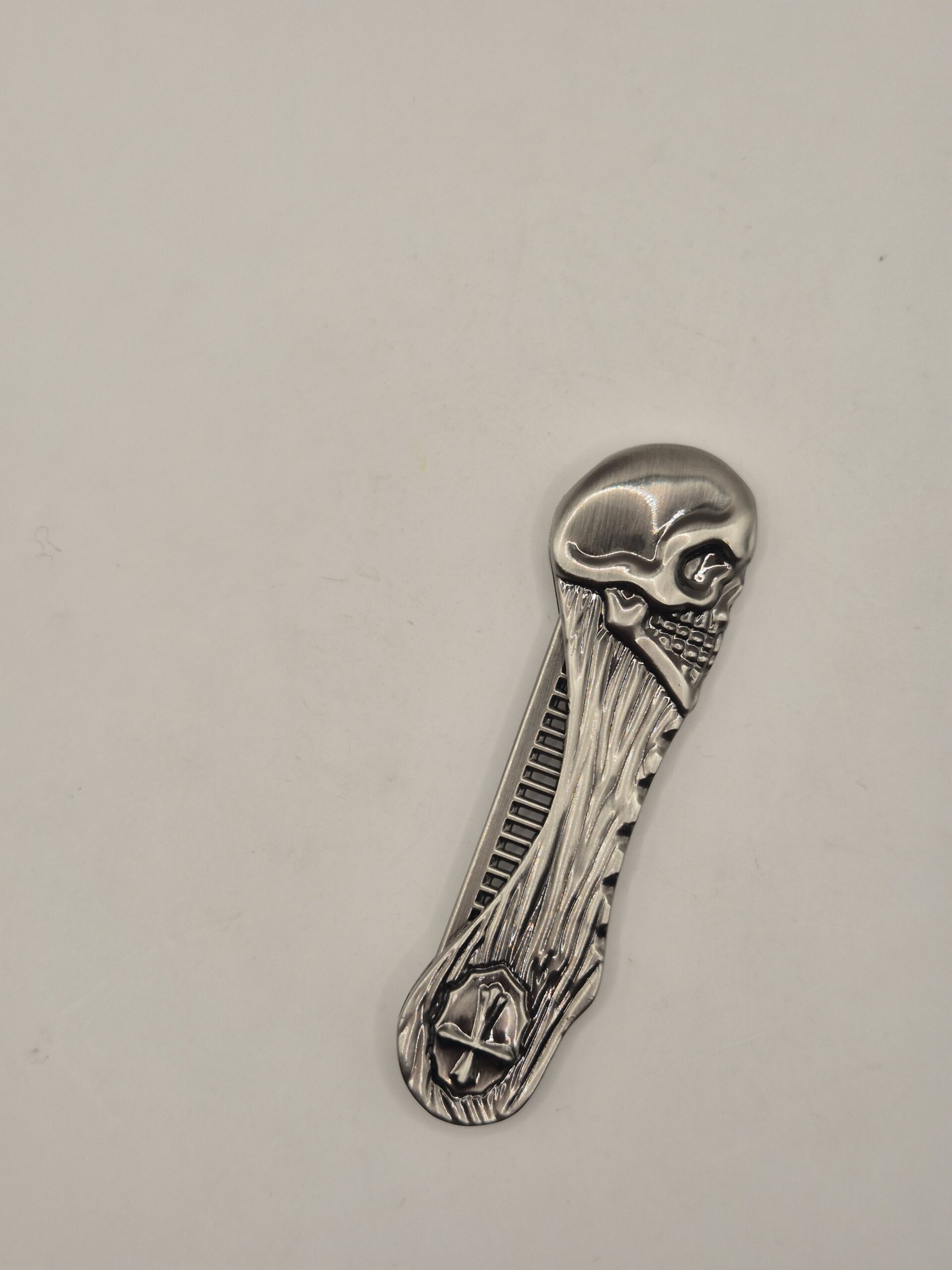 Material: metal. Diseño: calaca grabada. Tamaño portátil. Útil y coleccionable.