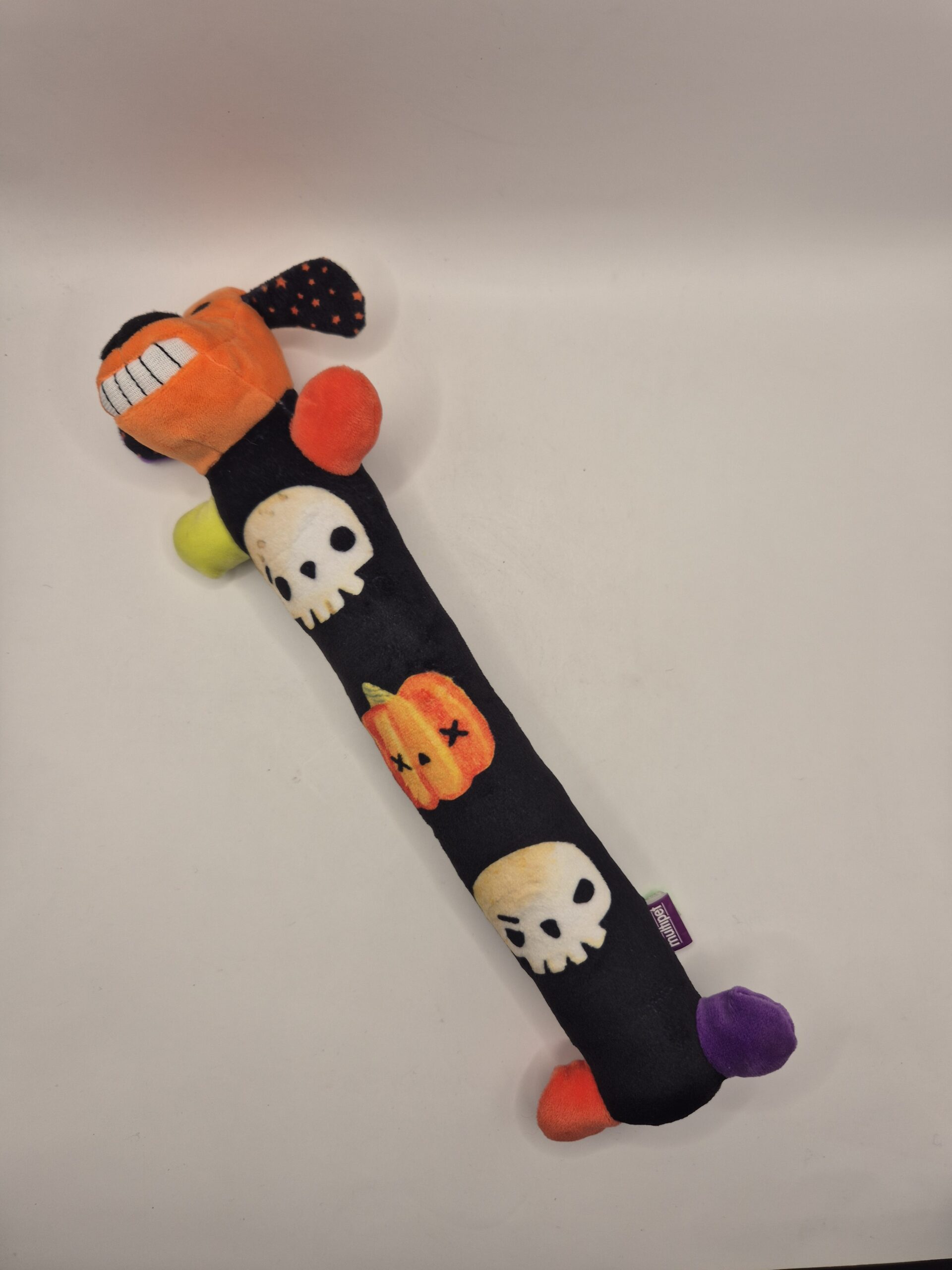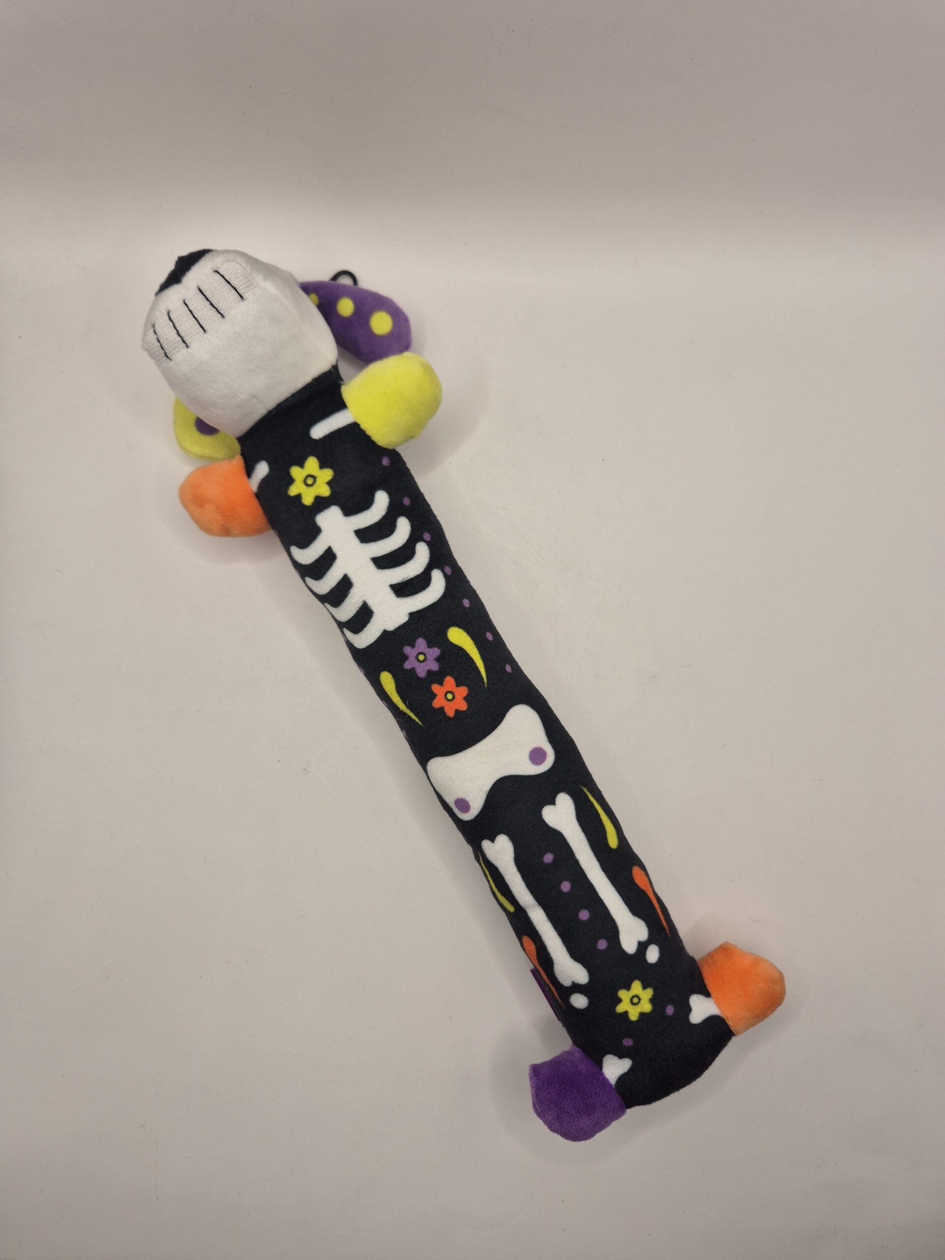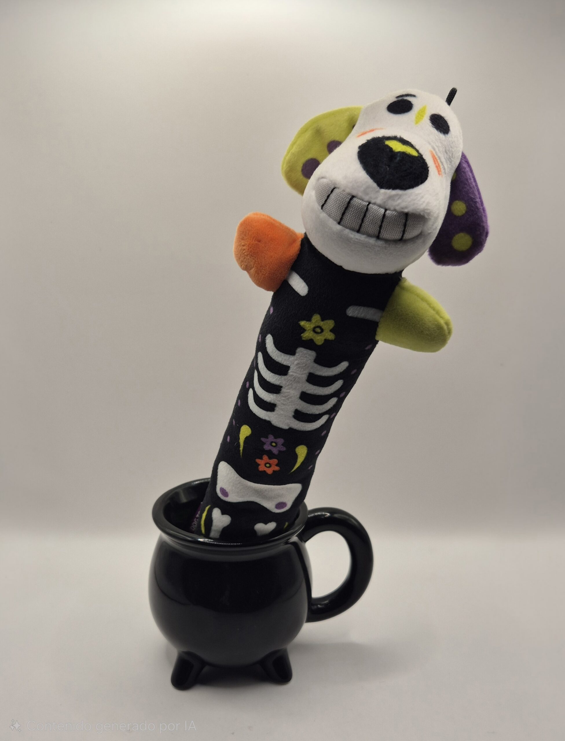 Juguete de peluche en forma de hueso con cabeza de perro y diseños de Día de Muertos o Halloween. Perfecto para que tu mascota destroce algo con estilo, juegue a traer con clase, o simplemente lo acapare como su posesión más preciada. Suave, resistente (hasta donde un perro lo permita), y lo suficientemente extraño para que las visitas pregunten dónde lo compraste.