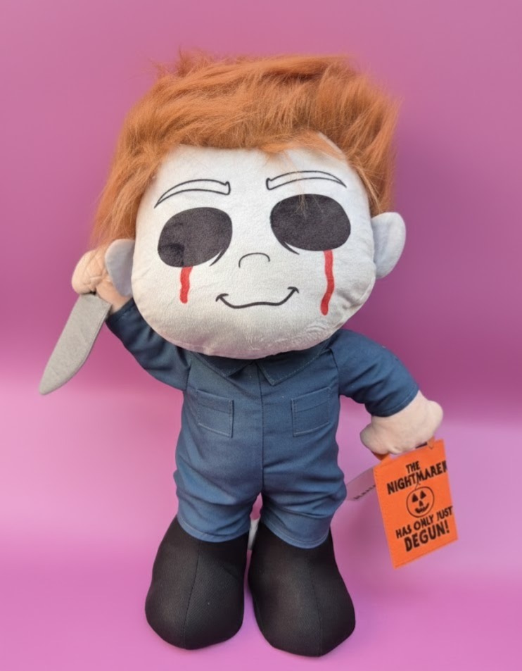Peluche Michael Myers de estilo coleccionable, inspirado en el personaje clásico del cine de terror. Presenta cabeza sobredimensionada con máscara blanca de rasgos simplificados, ojos negros y detalles gráficos en rojo de acabado estilizado (no realista). La expresión es neutra, con enfoque más estético que sangriento.