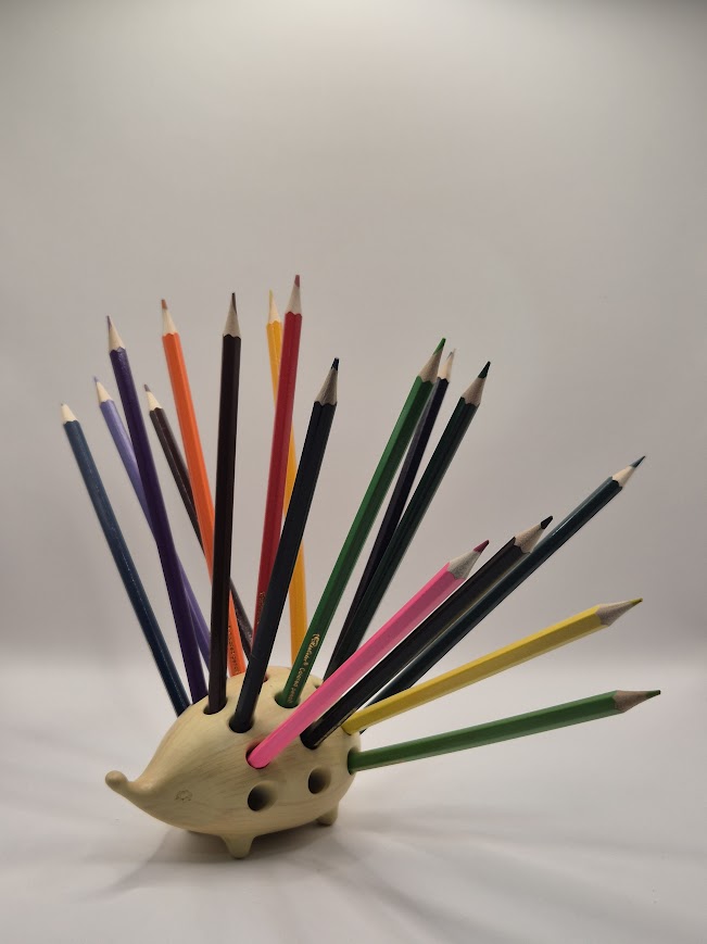 Portalápices de madera con diseño de erizo, donde cada lápiz funciona como una púa. Conforme se llena, el objeto cambia de apariencia y pasa de inofensivo a discretamente inquietante. Ideal para escritorios, talleres creativos o espacios donde el orden no tiene por qué ser aburrido.