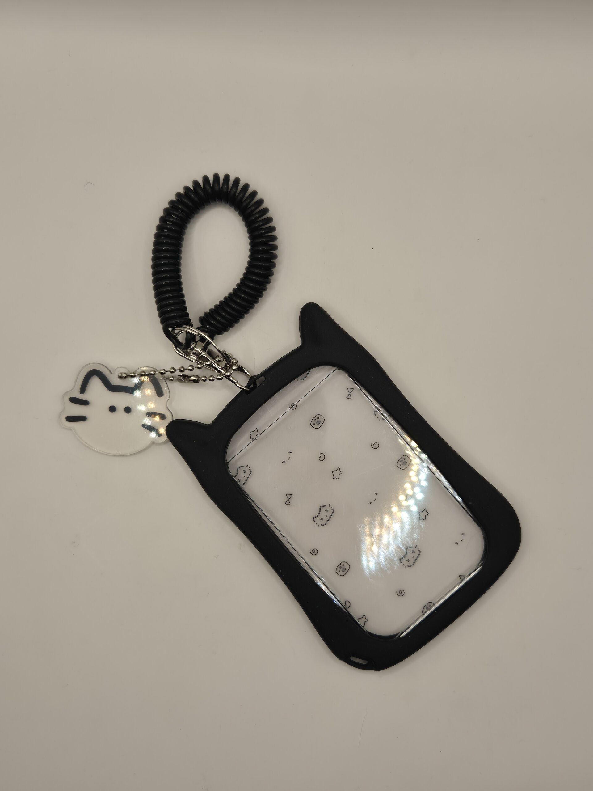 Portatarjeta de silicón negro con orejas de gato, resorte retráctil y charm incluido. Perfecto para tu gafete del trabajo, credencial de la escuela, o tarjeta de acceso que necesitas traer a la mano pero con estilo. La funda transparente protege tu tarjeta mientras el resorte te deja pasarla sin quitártela del cuello o mochila.