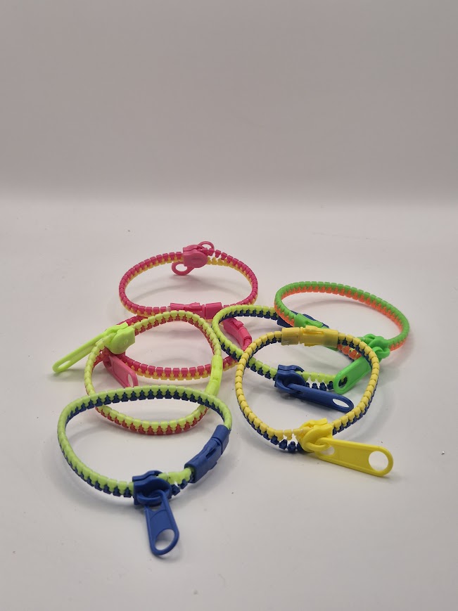 Pulseras tipo cremallera en colores brillantes, simples y funcionales, pensadas para jugar, combinar o solo traer algo inquietantemente satisfactorio en la muñeca. Se abren y cierran como cierre real, porque a veces lo divertido es mover cosas sin razón productiva.