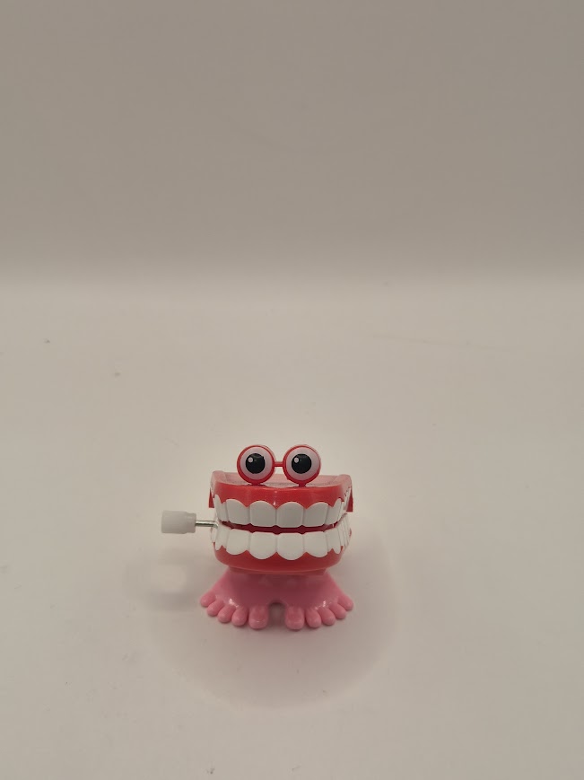 Funciona con mecanismo de cuerda: lo giras, lo sueltas y el caos comienza. Ideal para escritorios, repisas o para asustar ligeramente a quien no esperaba un robot con dentadura completa.