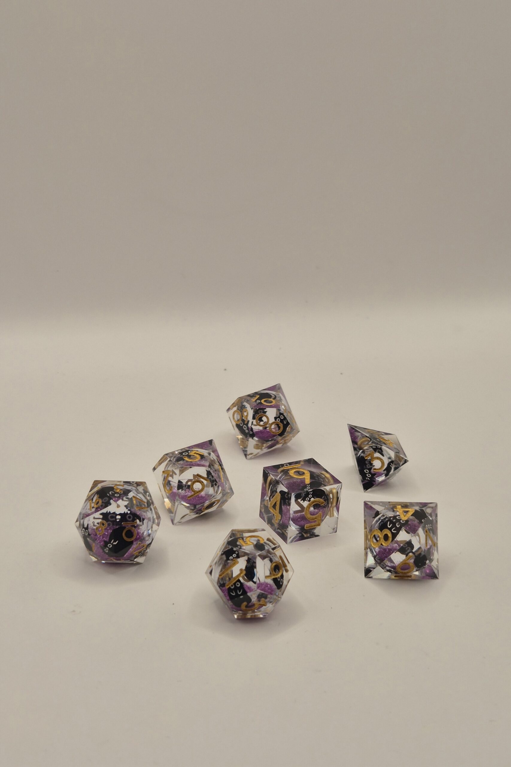 Set de dados con diseño de gato con encapsulado morado en resina transparente. Pensados para juegos de rol, mesas de decisión cuestionable o simplemente para verse bonitos mientras juzgan tus tiradas. Cada dado es funcional, legible y estéticamente sospechoso.