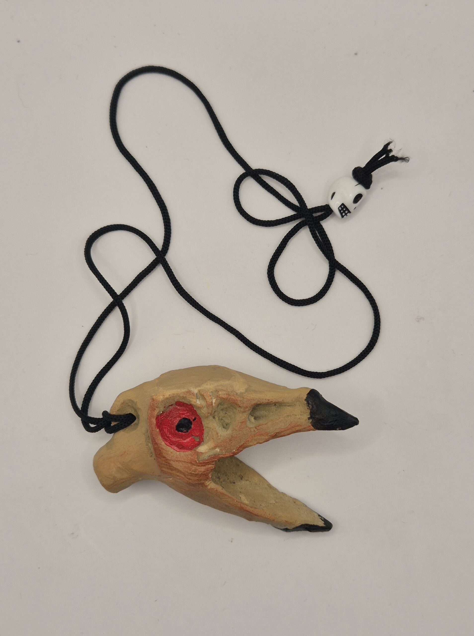 Funciona como silbato real, pero su verdadera fuerza está en la presencia. Al soplarlo no convoca aves, pero sí atención inmediata y una ligera incomodidad colectiva. El cordón permite llevarlo al cuello, listo para anunciar peligro, iniciar partidas improvisadas o simplemente colgarlo como amuleto extraño.
