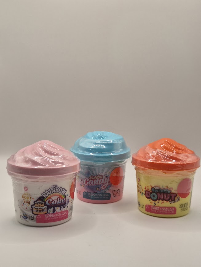 Slime suave y elástico con aromas dulces tipo postre, presentado en envases individuales. Ideal para apretar, estirar, distraerse un rato o simplemente dejarlo en el escritorio como objeto antiestrés improvisado. No es para comer, aunque se vea tentador.