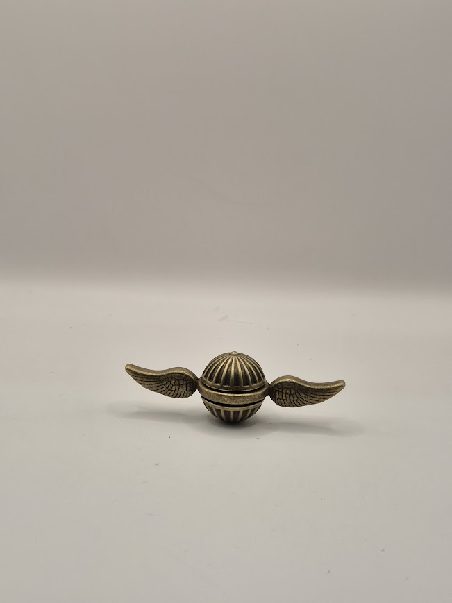 Spinner metálico con forma inspirada en una pelota de quidditch, compuesto por una esfera central y alas laterales simétricas. Su acabado envejecido remite a objetos mágicos de uso cotidiano, como si hubiera salido directo de una tienda especializada en artículos reglamentarios (y no tan reglamentarios). Gira con suavidad y buen peso, ideal para mantener las manos ocupadas mientras esperas tu turno, planeas hechizos o finges concentración.