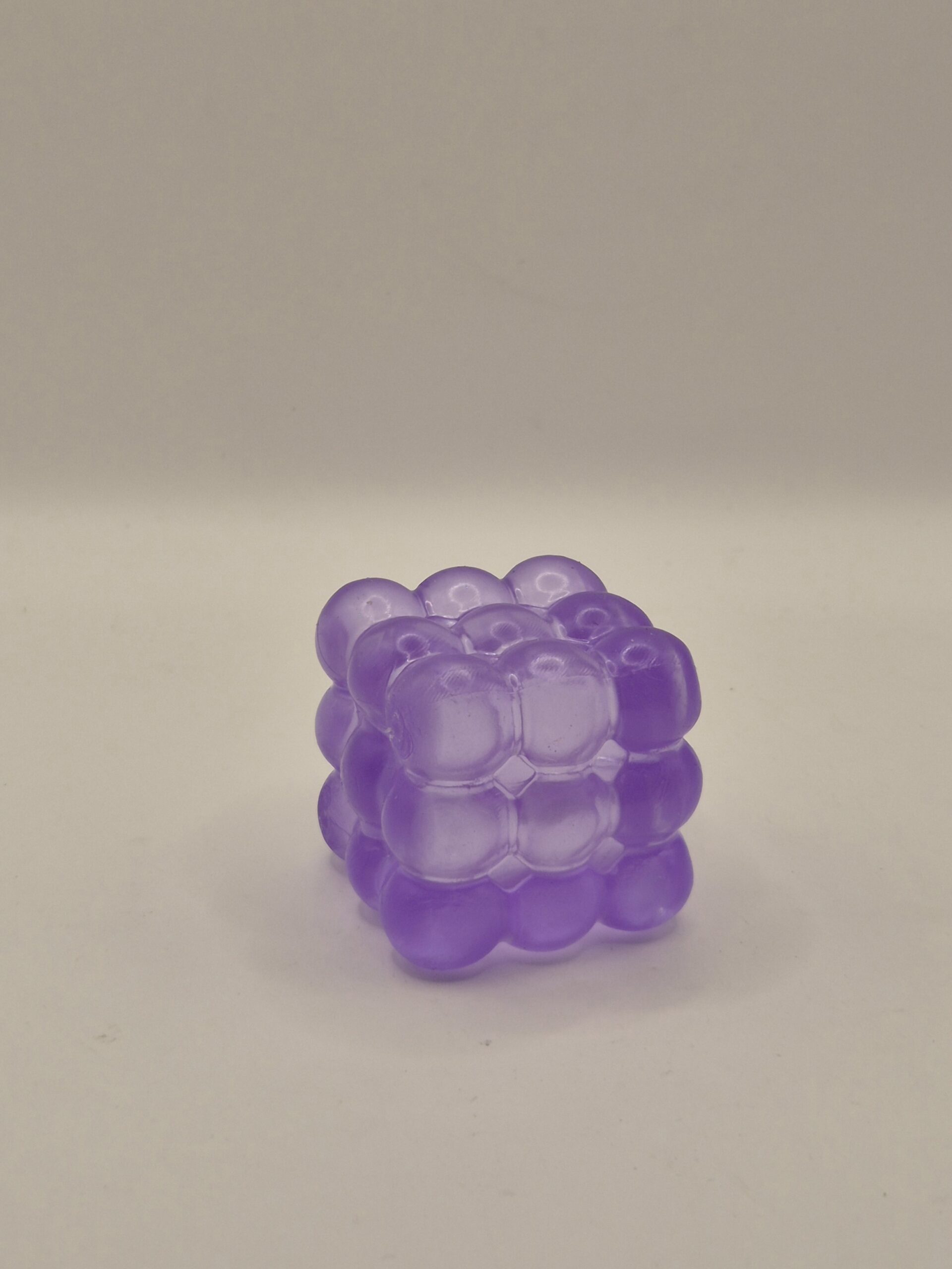 Material: goma suave translúcida. Diseño: cubo geométrico de esferas. Color: morado. Tamaño: cabe en la palma de la mano.