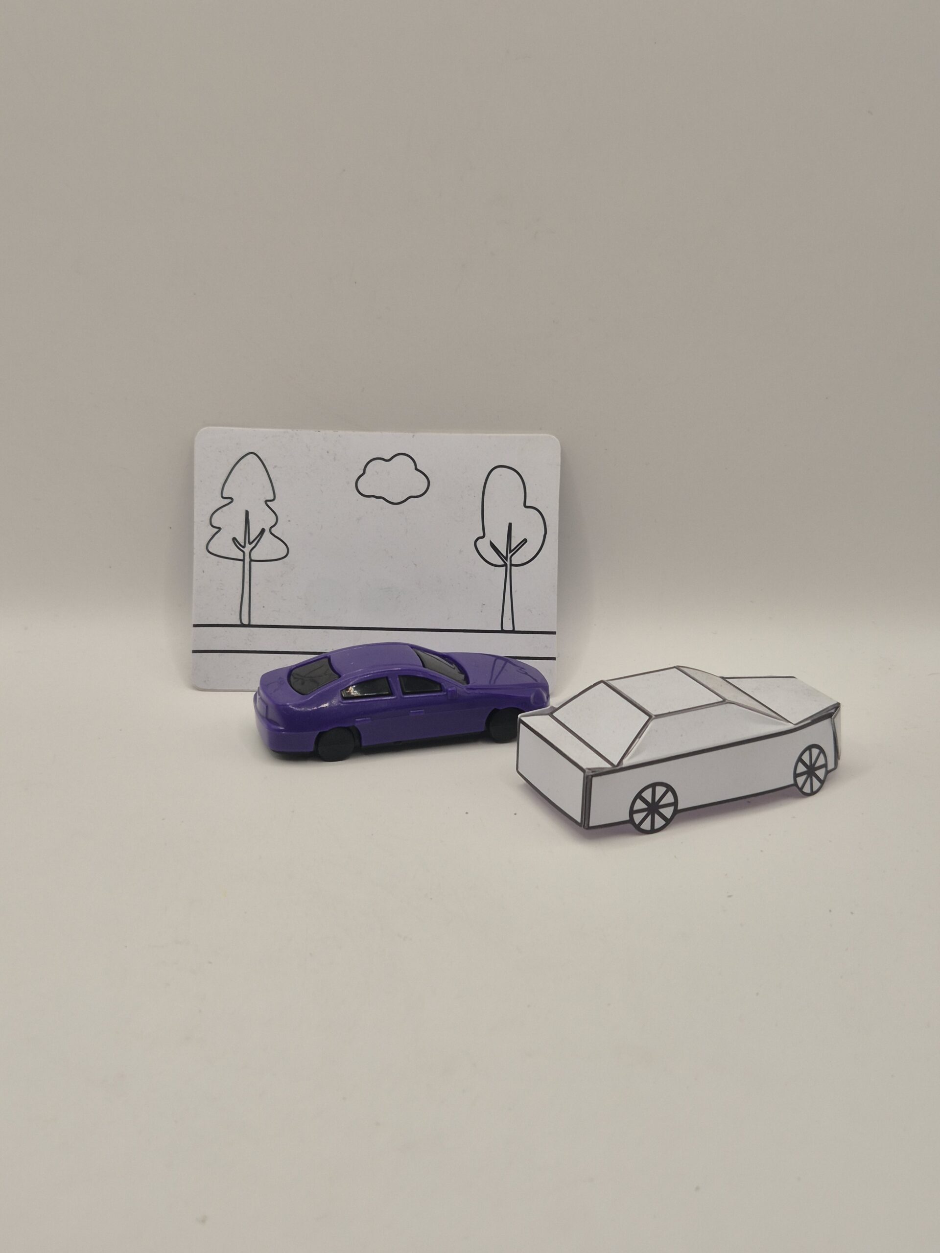Contenido: tarjeta con escenario, coche de papel y coche de plástico. Tamaño portátil. Incluye instrucciones.