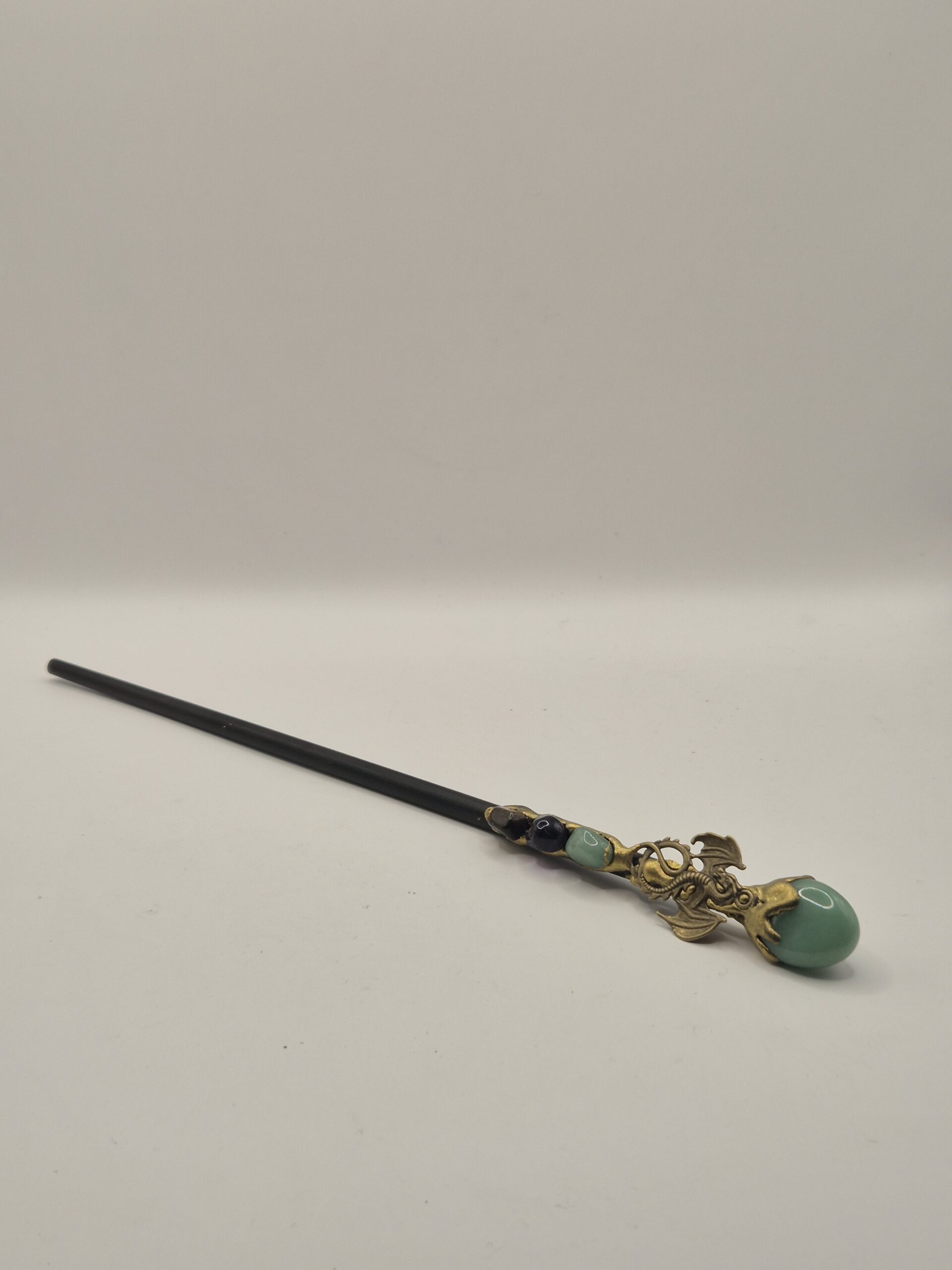 Material: resina tallada con piedra natural engarzada. Detalles metálicos decorativos. Largo: aproximadamente 25 cm. Disponibles: Aventurina y Amatista.